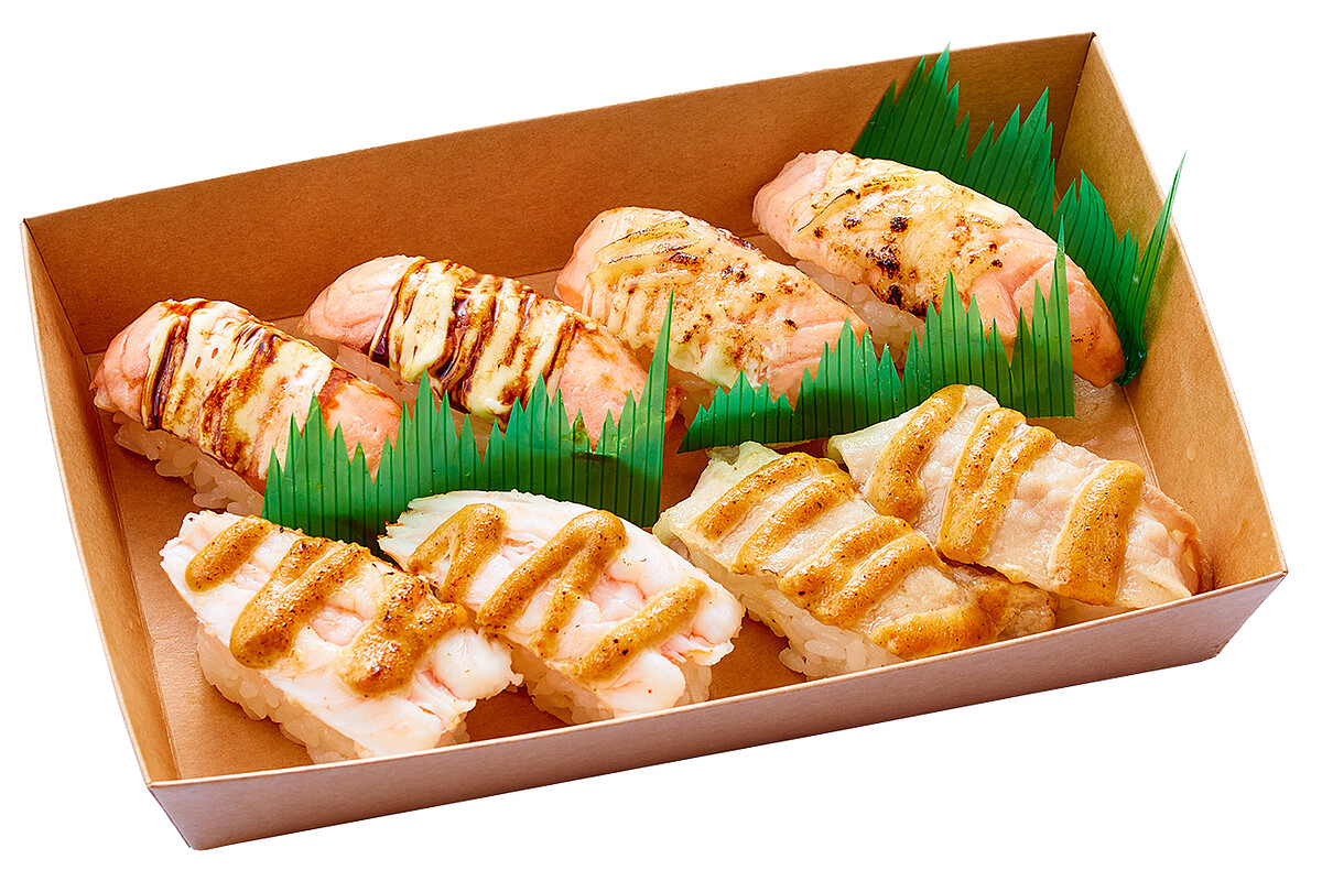 饕客喜愛的藏壽司炙烤系列組合,炙烤照燒鮭魚、炙烤起司鮭魚、炙烤蒜香鮮蝦、炙烤蒜香豬等人氣食材,炙烤後香氣十足,絕佳口感,唇齒留香!