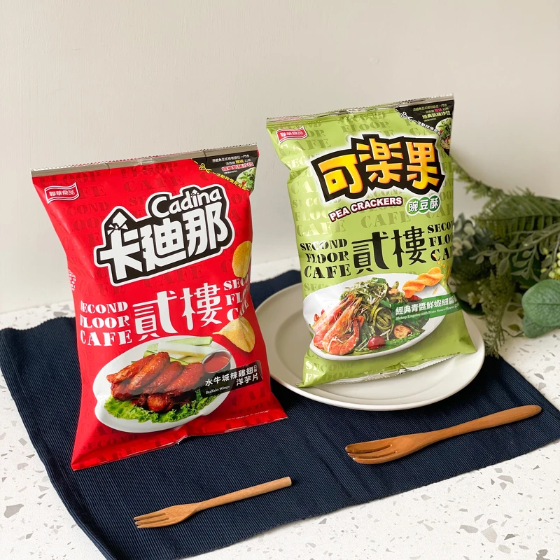 與人氣貳樓連鎖餐廳推出聯名款零食,將可樂果結合青醬鮮蝦,神還原貳樓餐廳熱門菜色經典青醬鮮蝦細扁麵。憑截角享有餐廳優惠。