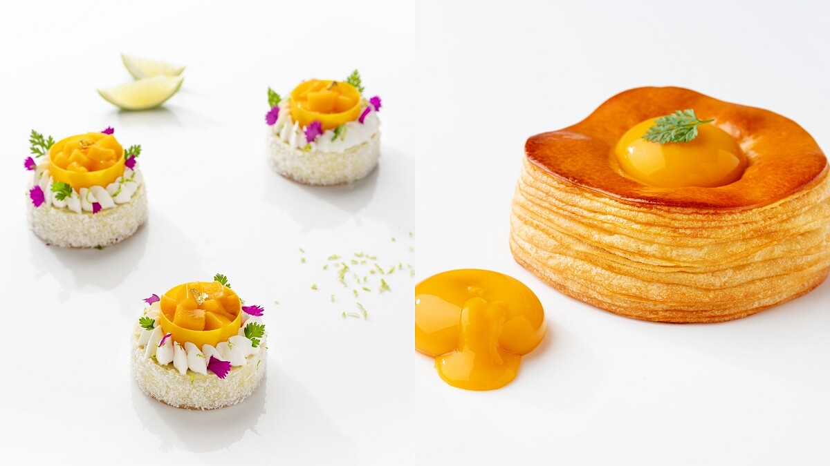 酒店內的文華餅房即日起推出「香芒一夏」芒果季甜點,最吸睛的5吋大「青檸芒果交響曲」蛋糕用抹茶餅乾為基底,搭配鬆軟香草海綿蛋糕、芒果果醬,能同時品嚐到芒果果粒、柚子凝乳、馬斯卡彭慕斯、青檸葉香氣,上頭還有一朵白巧克力打造的芒果與花朵,每一口都能享用香甜夏日滋味。
