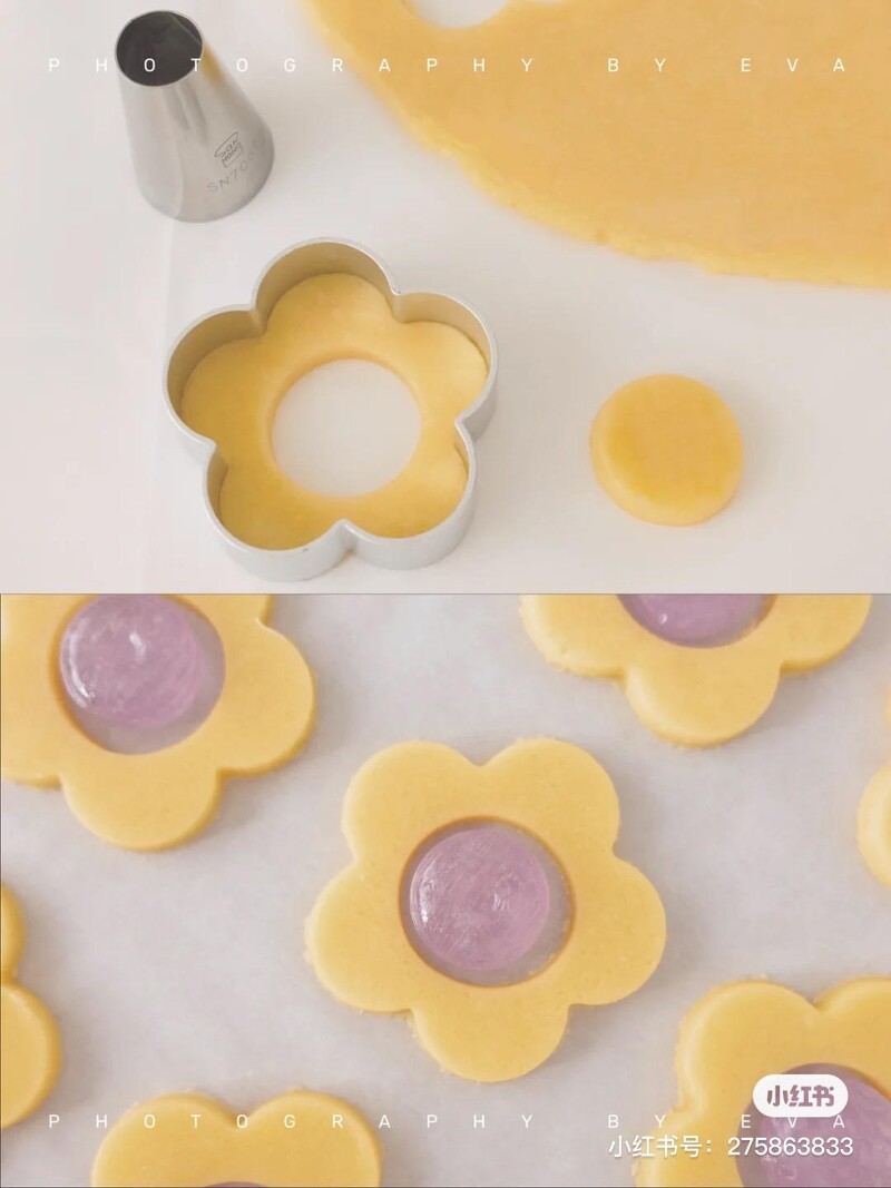步驟七、使用模具壓出花型,在烤盤上鋪上烘焙紙,花中心放入水果糖