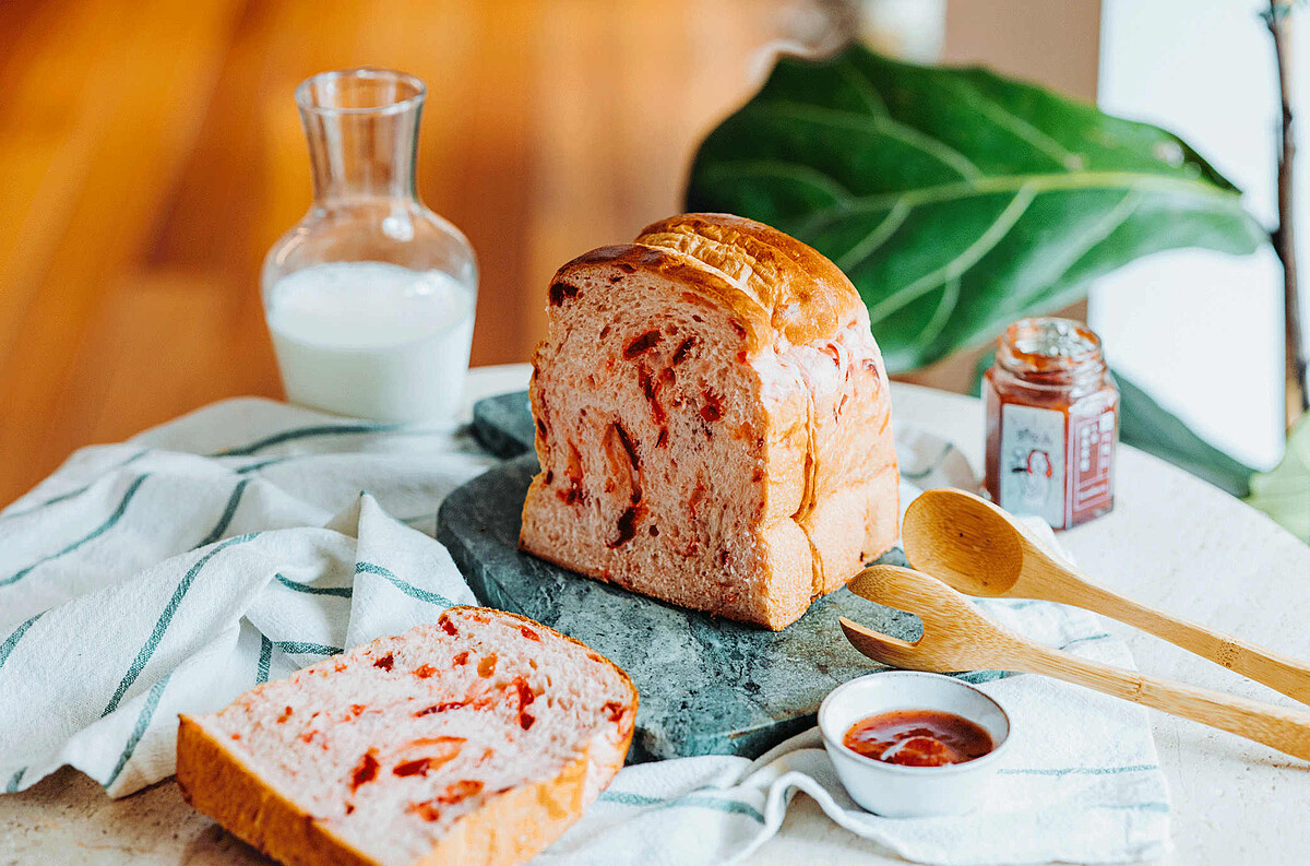 合力粉紅琴酒是以洛神花、水蜜桃、紅玉紅茶、野薑花等為基底釀製,帶有夢幻的粉紅色澤,口味層次豐富。武子靖以洛神花為吐司主調,再搭配蜂蜜的甜香,設計出呼應粉紅琴酒的酸甜滋味。製作時,武子靖先將洛神花長時間浸漬在粉紅琴酒內,吸飽酒精後,再於烘焙時自然釋放出淡淡酒香。
