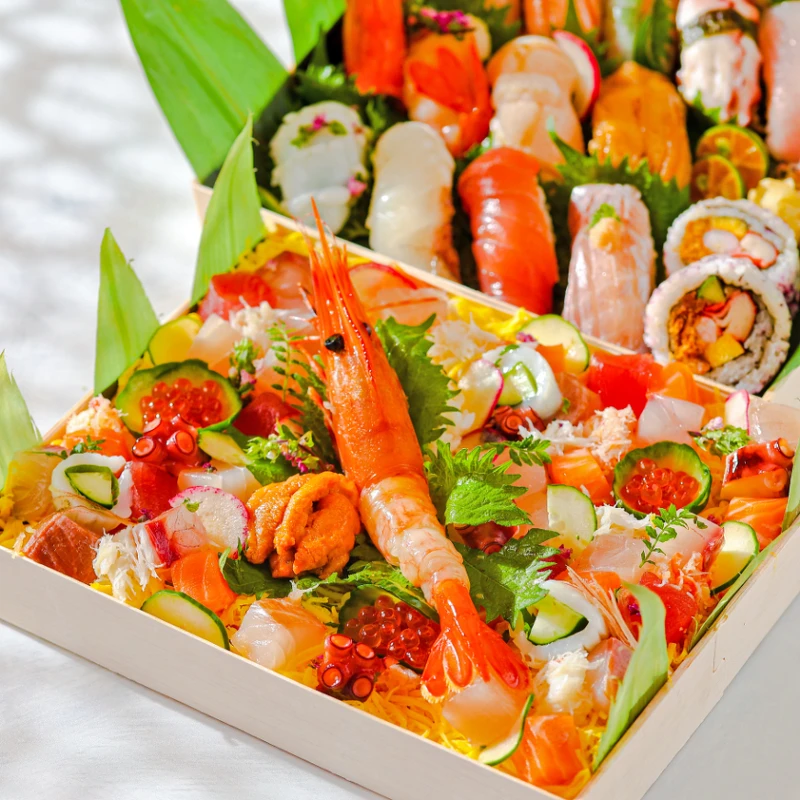 同樣是視覺、味覺雙重饗宴的「極品散壽司盛合」,將台東池上越光米鋪上鮪魚、旗魚、鯛魚、紅魽、鮭魚、鰻魚、牡丹蝦、章魚、花枝等新鮮漁獲,最後再用海膽、鮭魚卵與松葉蟹肉提升豪華質感,滿滿的海鮮立刻將漫長宅家煩悶一掃而空!原價1480元,限時優惠價980元。