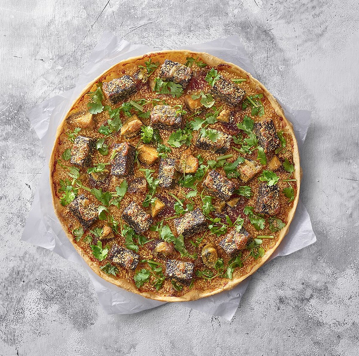這款「香菜皮蛋豬血糕比薩」選用雲林小農契種香菜,再鋪滿滷香豬血糕及Q彈爽口的皮蛋,以及香甜的雲林花生粉,鹹香鹹甜的滋味意外撞出新驚喜,無論是香菜教徒,或是皮蛋、豬血糕的鐵粉,都得嚐一波才行啊!