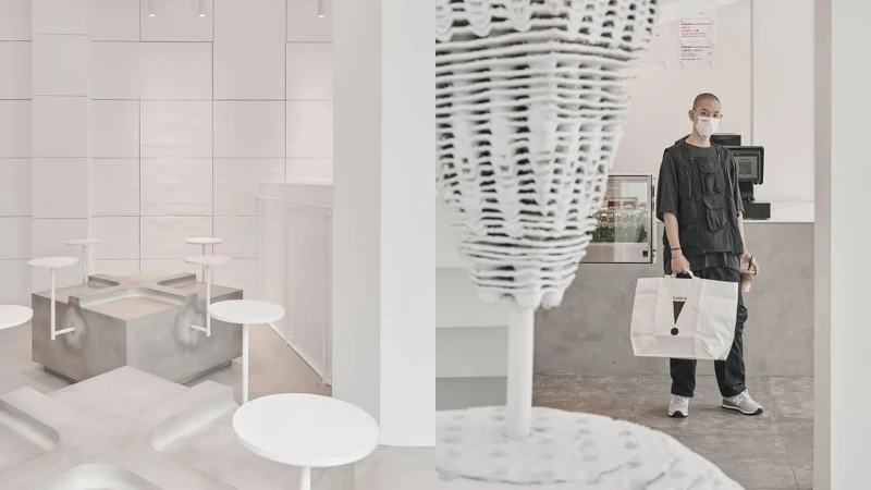 進到店內還可以看到以外帶杯架的環保紙漿紙為靈感素材,層層疊砌形塑成超過兩公尺的巨大立體驚嘆號,絕對是旗艦店最重要的標地,而開放式的無隔間狀態,則減去傳統對號入座的制式感,讓消費者能夠感覺更加自在舒適。
