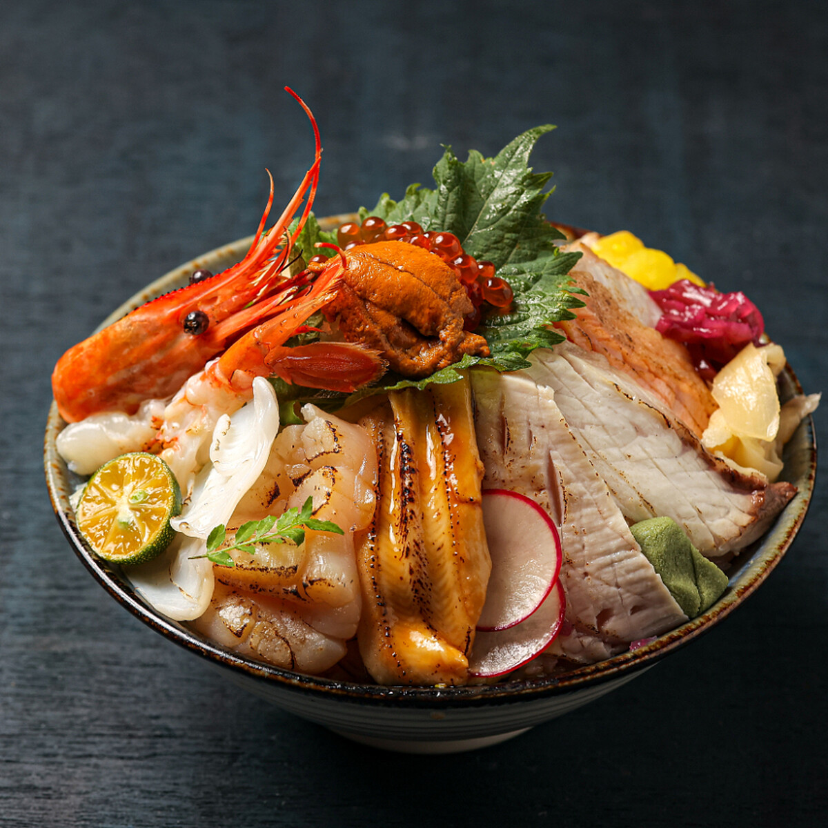 另外代表大海的美味「極上炙燒散壽司」,選用10多種現流海鮮,包含鮭魚、鮪魚、鯛魚、牡丹蝦、海鱺魚、星鰻、真鯛、北海道干貝、新鮮海膽,經精切後再用噴槍炙燒提升油脂與口感層次。最後不忘用鮭魚卵點綴,完成這道視覺、味覺雙重饗宴。