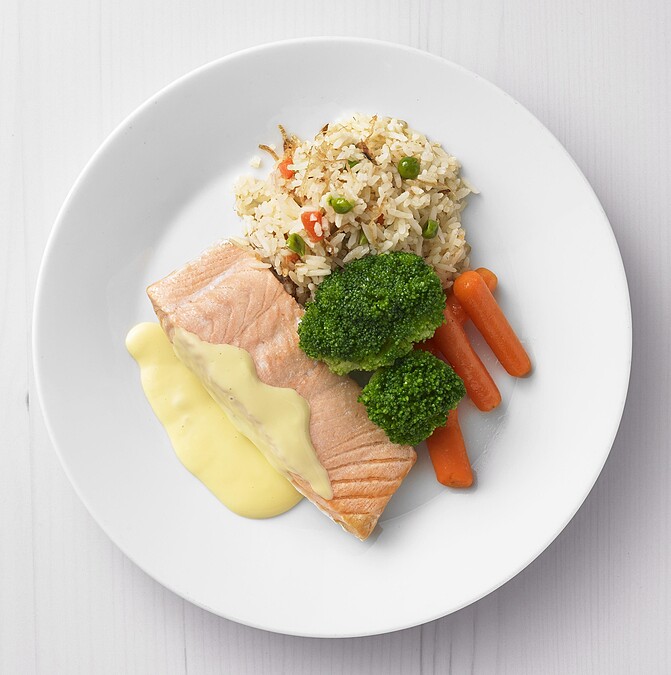 想要來點飽足感,鮭魚菲力和風炒飯不失為一道好選擇!採用經水產養殖管理委員會ASC認證魚場的鮭魚,兼具營養與美味。搭配滑順荷蘭醬、和風炒飯及雙色蔬菜,口感酸甜又清爽。