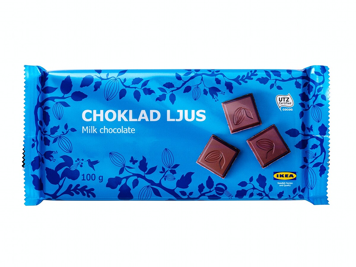 在超市販賣的CHOKLAD LJUS牛奶巧克力,也是平易近人的銅板價甜點。採用通過國際UTZ認證可可豆製成、可可含量30%,以適中甜度、好吃又便宜等特色受到消費者滿滿好評。