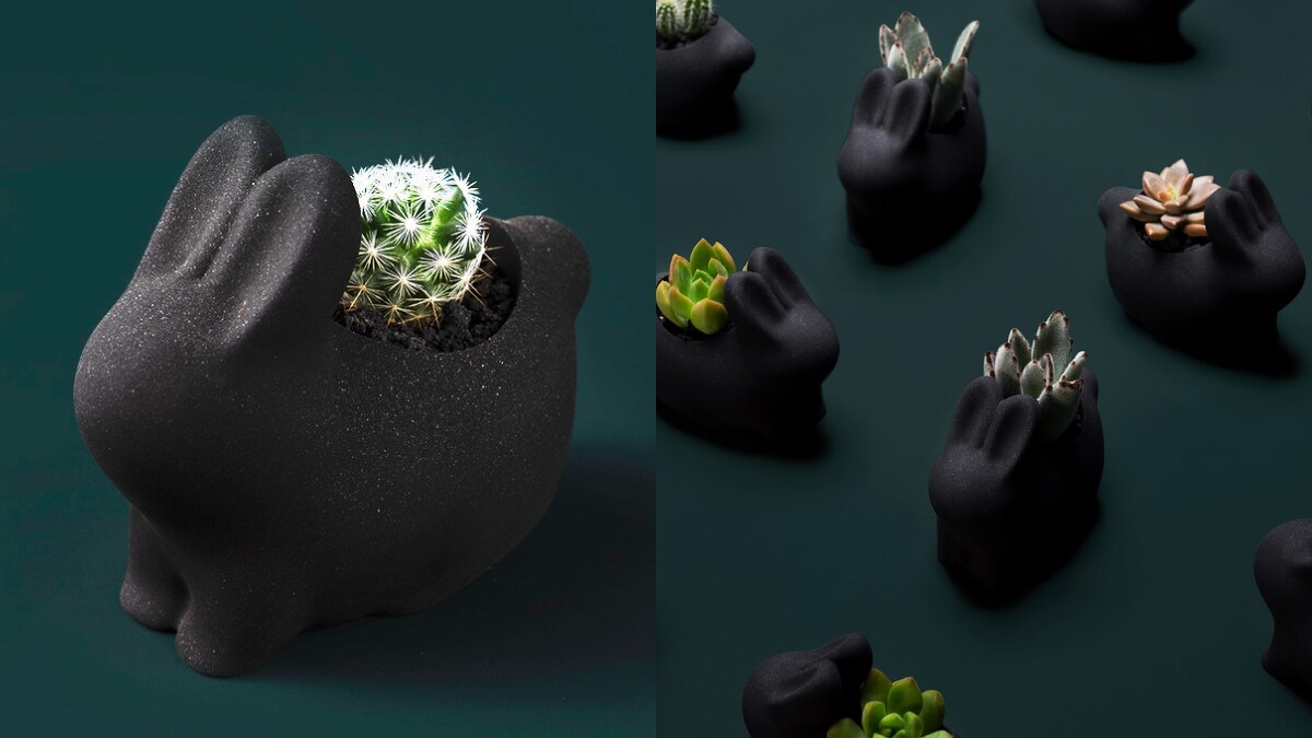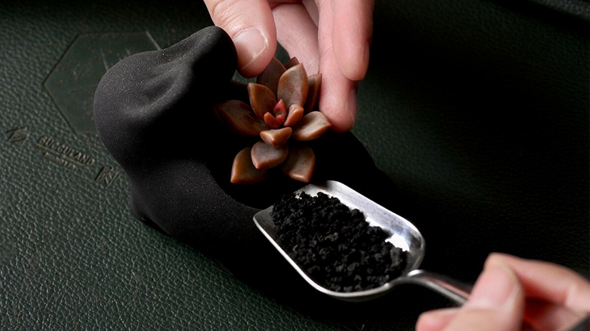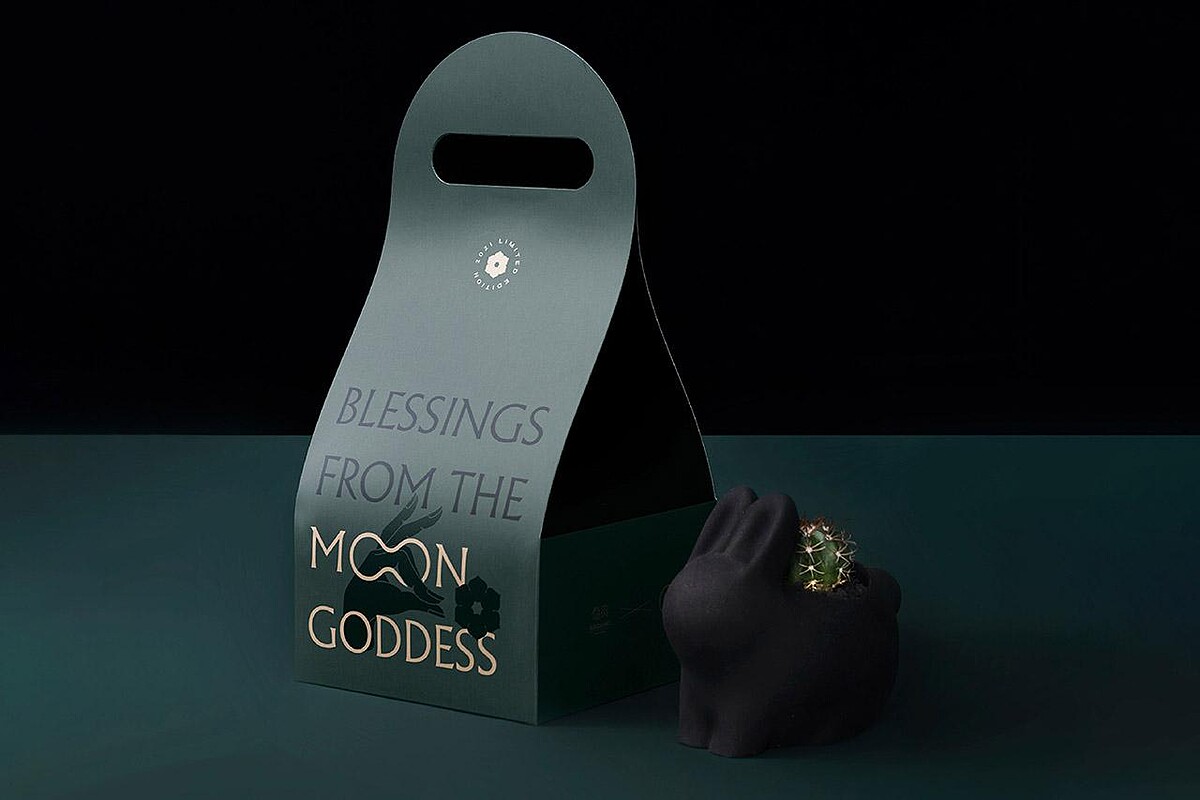 禮盒另外一個吸睛之處,便是將傳統民間故事吉祥物「月兔」結合品牌的綠色植物主軸、轉變成用黑色水泥製作的「墨麗兔盆栽」。全黑色調能看到金色細沙閃閃發光,呈現出如黑絲絨般的神秘魔幻質感。而這樣的設計也更能襯托出多肉植物之美,低調卻叫人難以移開目光。