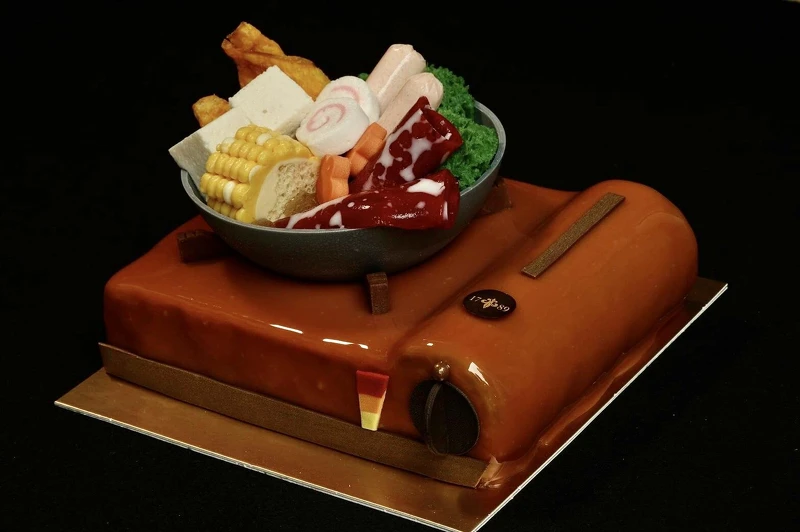 法籍主廚以台灣人最愛的美食「火鍋」為靈感發想,推出限量50組的擬真「火鍋」蛋糕,使用酸甜水果、巧克力等,製作9種不同的「火鍋料」;下層「瓦斯爐」則使用70%法國巧克力蛋糕捲與山核桃焦糖巧克力蛋糕堆疊打造出多層次口感,超吸睛的火鍋造型絕對是打卡必備的父親節蛋糕!