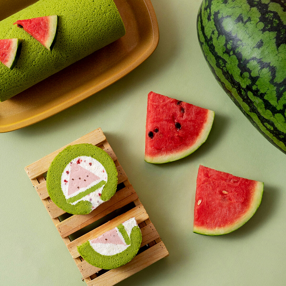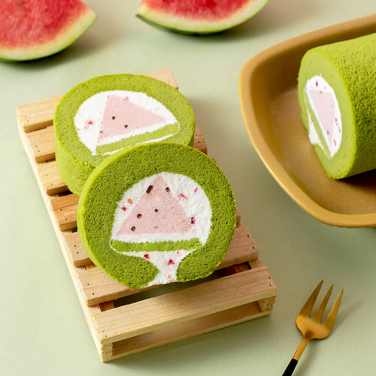 抹茶的蛋糕體為基底,將香甜多汁的西瓜拌生乳餡,再搭配原味生乳餡拌入莓果碎粒。