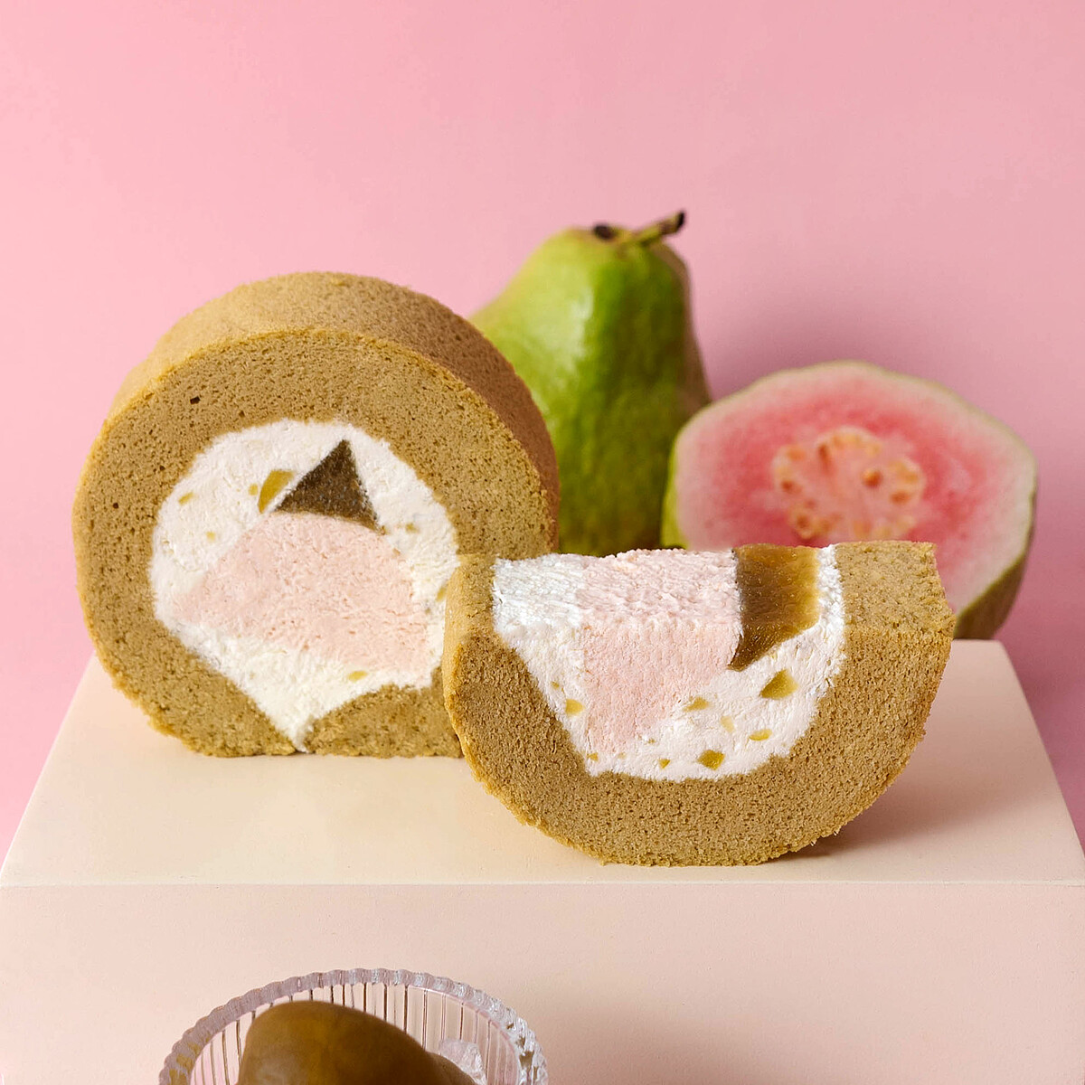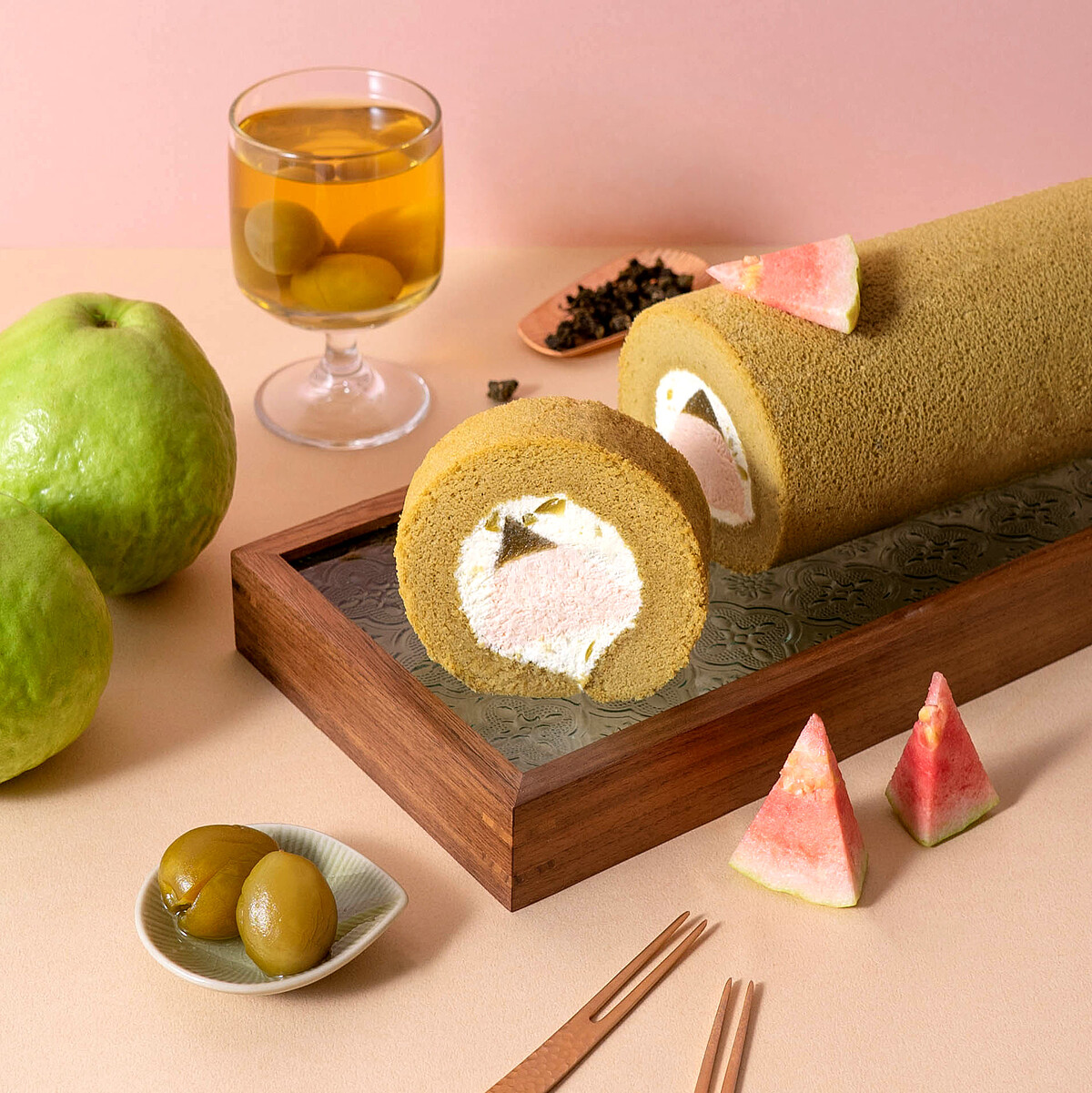 以茉莉花茶蛋糕體為基底,生乳餡中拌入脆梅,搭配紅心芭樂製成的內餡及梅酒凍。