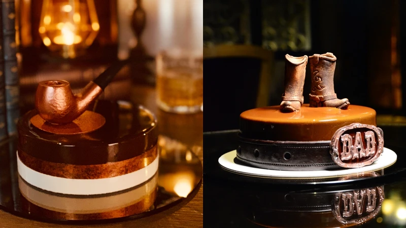 同樣歷年來都推出別出心裁蛋糕慶祝的君品酒店,今年一共推出三款,最搶眼的莫過於「君品雪茄」,將咖啡豆、奶油調製出咖啡香堤奶油餡,外層則包覆苦甜巧克力,並用打碎咖啡豆製造煙灰效果,帶出男人沈穩內斂性格。另外有用菸斗、牛仔皮靴分別詮釋「哲學家老爸」、「運動健將老爸」蛋糕,你的爸爸屬於哪一型呢?售價980~1580元不等。