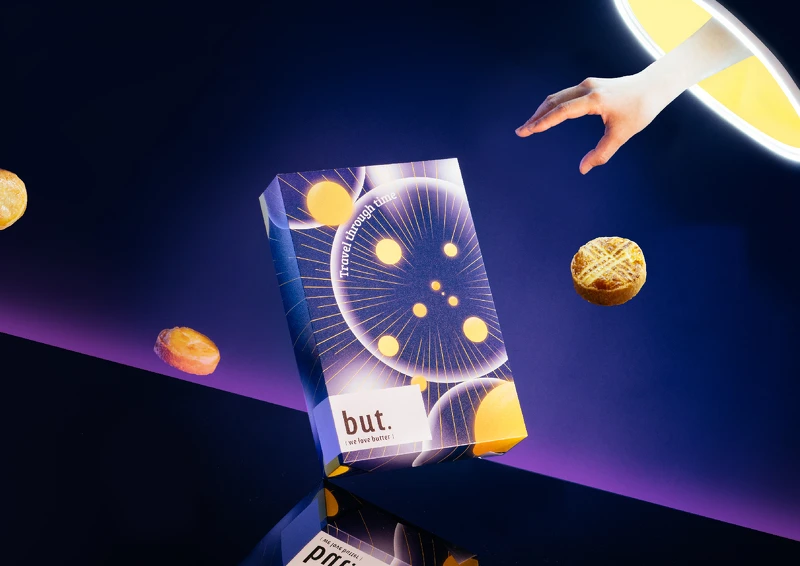 but. we love butter奶油甜點這次的中秋禮盒「Travel through time!穿越奶油時空」以穿越時間、穿越空間,越過晦暗不明的過去為題,包裝也充滿三次元的意象,藍黃色調設計迷幻感十足。