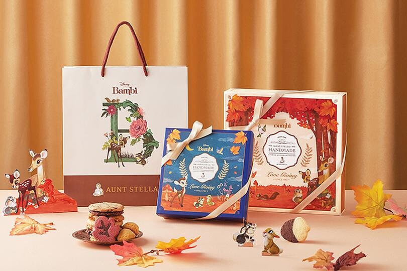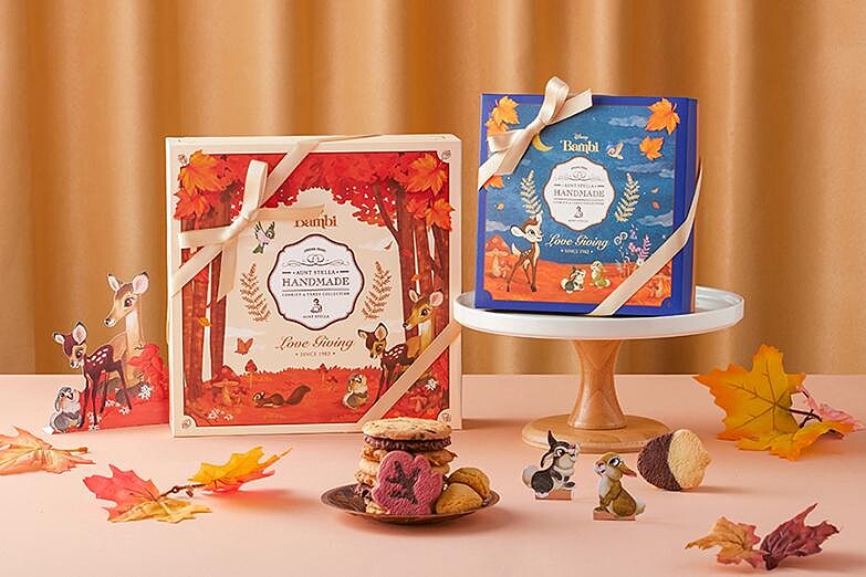Aunt Stella詩特莉繼夢幻的愛麗絲夢遊仙境禮盒後,這次以迪士尼動畫《小鹿斑比》及秋季楓紅樹林為主題,共有白天、黑夜兩款不同禮盒設計,更推出了全新楓葉、橡果造型手工餅乾,療癒指數爆表,絕對是最萌的中秋節禮盒!