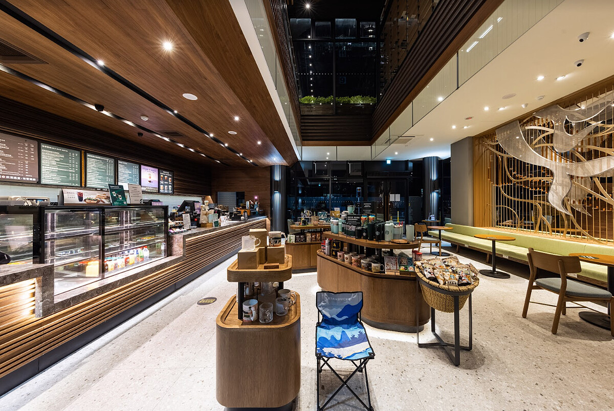 走進門市後,映入眼簾的是一樓中靠背沙發區的玻璃藝品,結合鐵件及玻璃管組成的波浪意象及女神魚尾交纏髮絲,並與在地文創結合,融入當地玻璃藝術,感受雅致而高貴的整體氛圍;二樓獨具特色的戶外客席區,如隱其中,璀璨迷人大樓夜景相呼應,打造出獨具氛圍的咖啡空間。