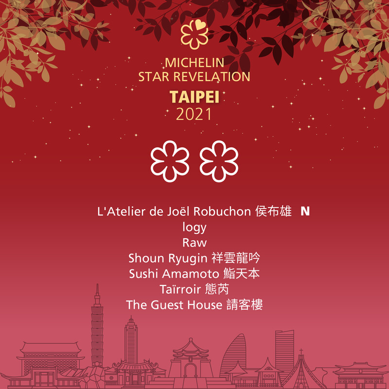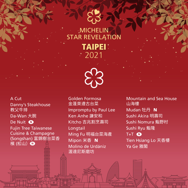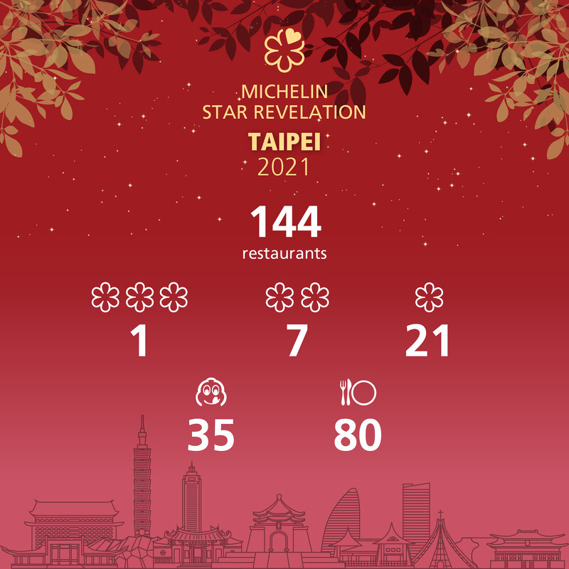 台北摘星餐廳名單如下,包含1間米其林三星餐廳、7間米其林二星餐廳(包括1間晉升)、21間米其林一星餐廳(包括3間新入選、2家晉升)等共29間餐廳獲得星級殊榮。