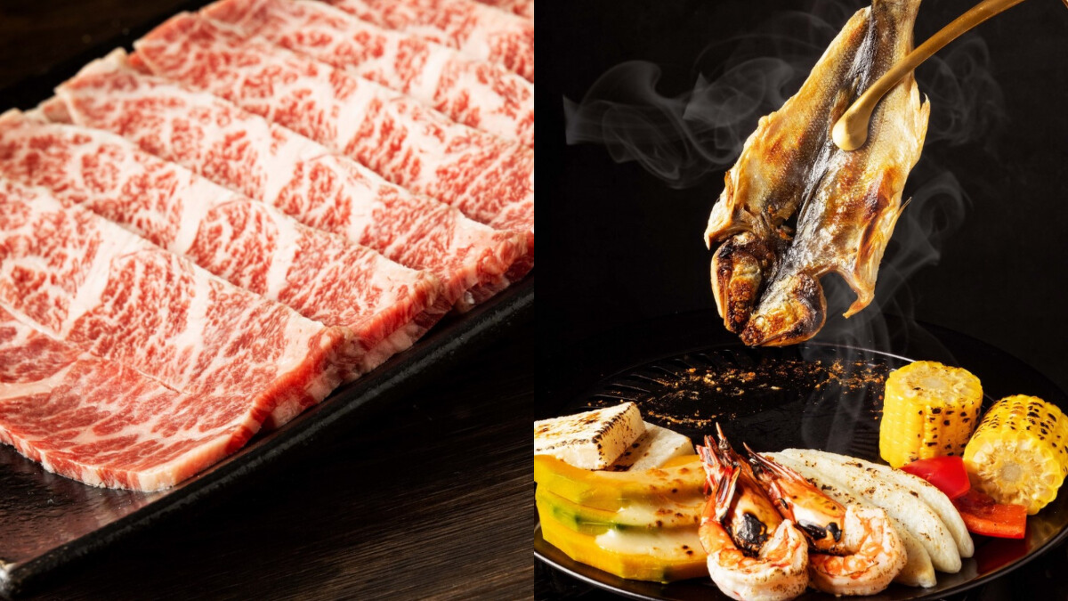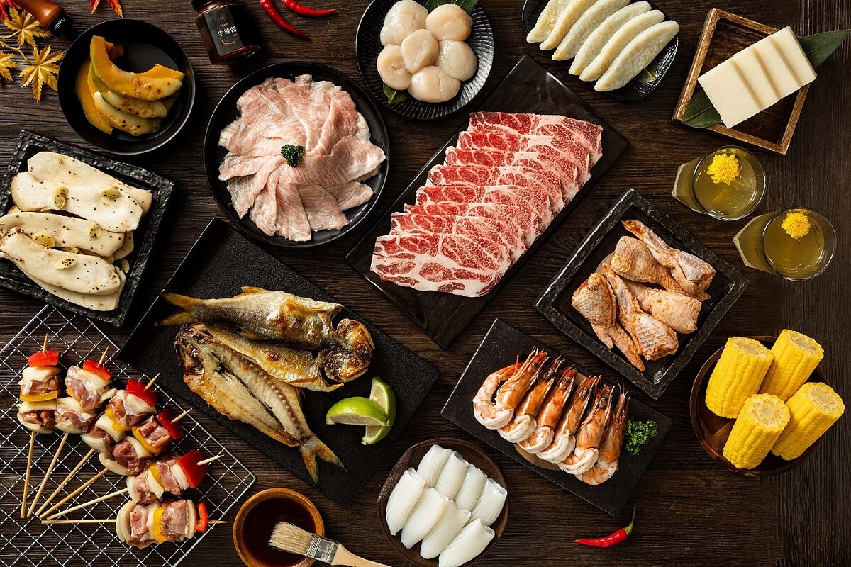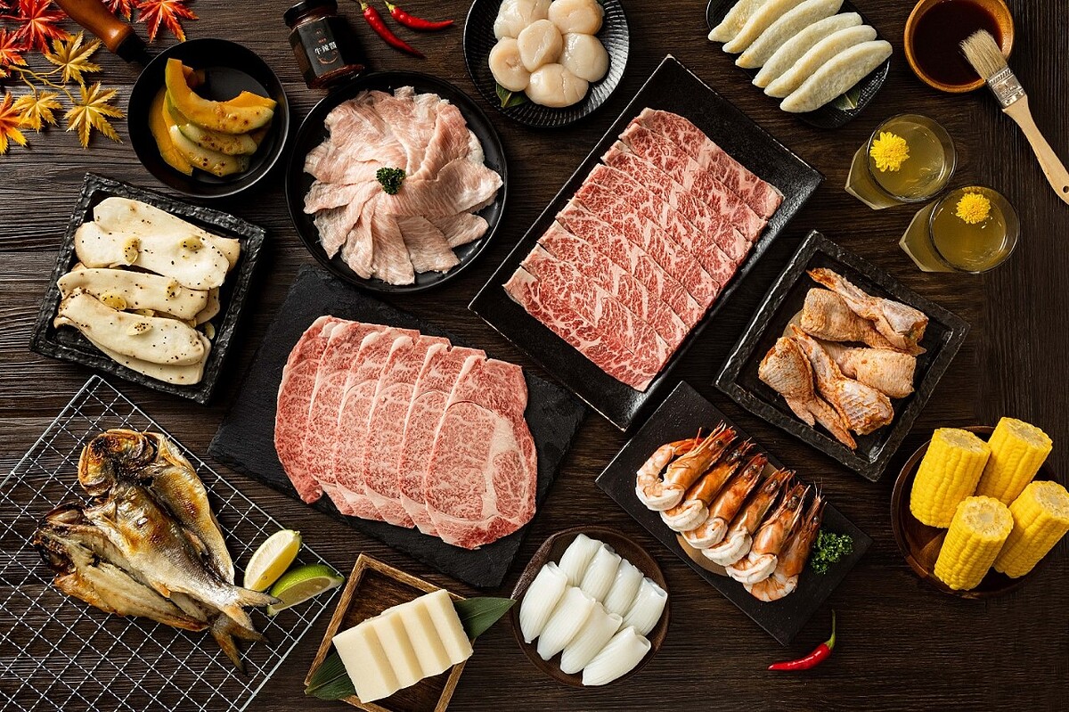 《橘色涮涮屋》首度推出的兩款奢華烤肉組合,適合4-6人同住小家庭,「中秋和牛海陸饗」包含A5黑毛和牛嫩肩,其油花分布細緻均勻,呈現淡淡粉紅色,入口即化的銷魂口感令饕客無法忘懷。另包含美國頂級Prime小牛排、梨漬松阪豬及日式手羽明太子皆可一次品嚐到,更嚴選日本花枝片、日本干貝、去殼海草蝦、午魚一夜干等多款鮮美海味,再搭配奶油日本玉米、起司栗子南瓜、日本竹葉魚糕等蔬食單品,以及清爽解膩的養生菊花茶,每套6,800元。