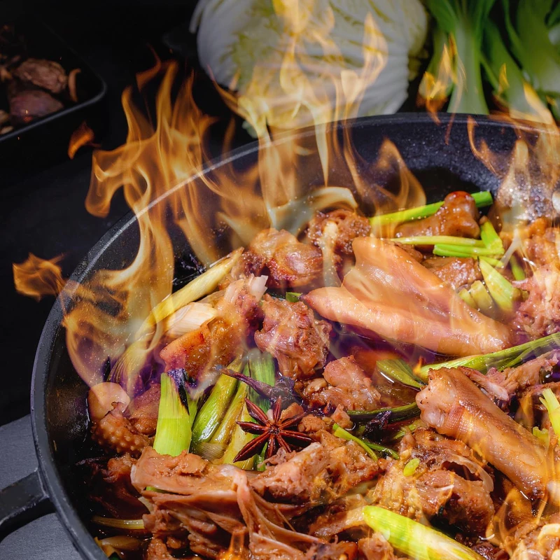 如何吃到最美味的火焰鵝?其實不能在開蓋時就立刻享用,推薦大家稍微等個一兩分鐘後,鵝肉邊緣會出現微焦,這時候是最佳品嚐時機!表面微焦、肉質鮮嫩入味、香甜可口,吃完鵝肉,最後再加進高湯與高麗菜,在殘留醬汁和煮下來的鵝油中燜煮入味,也非常美味!