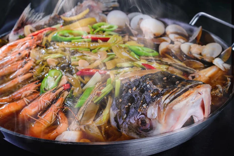 順德蒸魚十分注重清、鮮、嫩、滑的口感,因此這道料理對魚的品質要求嚴格,需要即殺即蒸。而大盤魚更是在順德菜裡招牌中的招牌, 澳門贏到足選用重達六斤的大頭鰱,加入秘製中藥醬汁、自製酸菜、慢熬大骨湯底,與蛤蜊、鮮活草蝦共煮,以蝦貝的甜,吊出魚肉鮮味。通常主廚只會把這道菜料理至七八分熟,上桌後還是需要開火文煮才能享用。而且越煮越入味,每一口都維持「剛斷生」的熟度,感受魚肉的鮮甜與嫩滑。