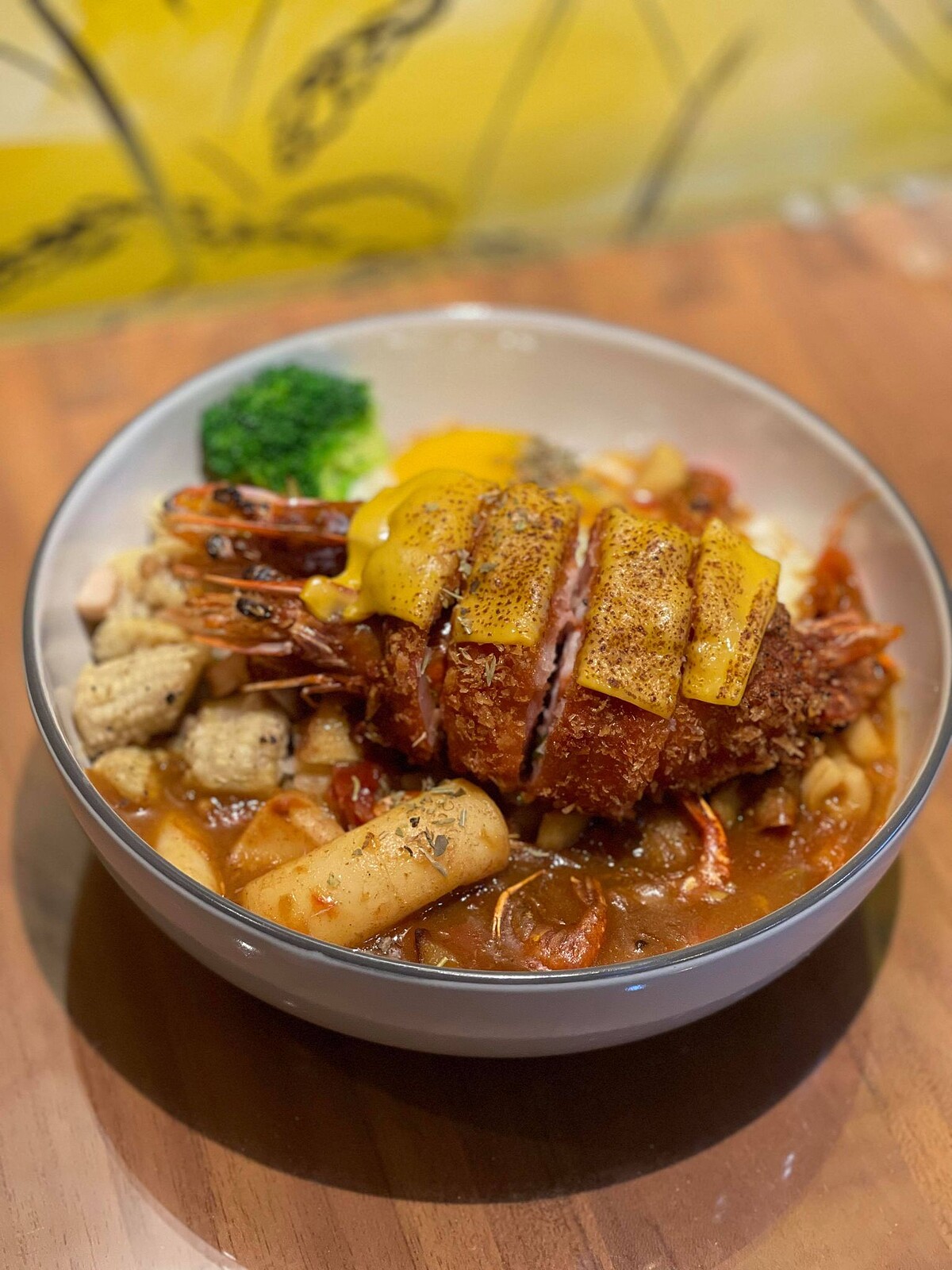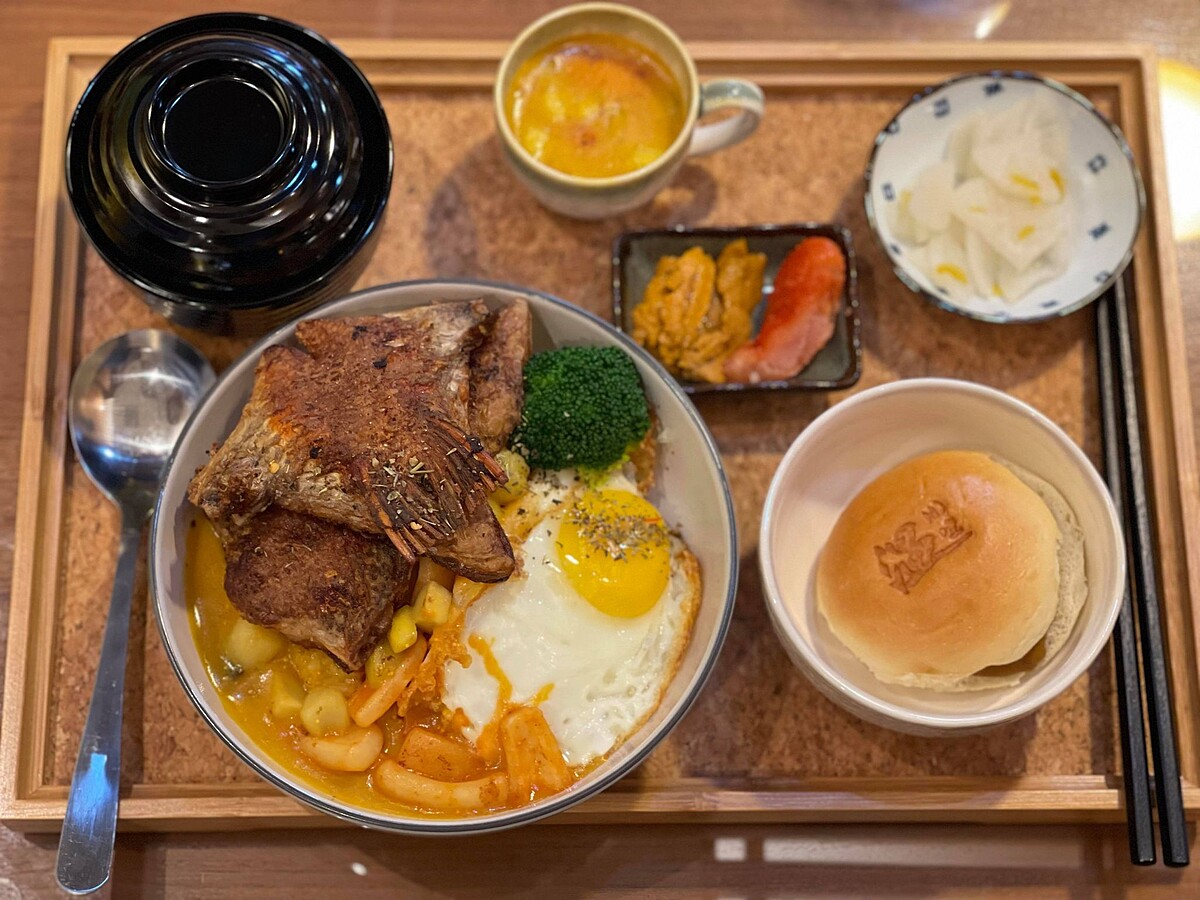 還有許多顧客吃完後大推的「自製蝦醬咖哩佐手打蝦排」,鮮醇的蝦膏搭配各式香料做成的濃郁咖哩,以及加上自製蝦餅,金黃酥脆的外皮包裹著Q彈蝦漿,硬派的包入兩隻大蝦,入口充滿蝦膏的甘醇,實在超幸福。