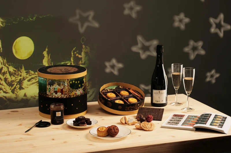 agnès b. 法式月餅禮盒以Agnès女士最愛的電影《月球旅行記》為靈感打造,更特別推出了台灣限定軟心巧克力月餅,完美糅合傳統與創新滋味,月餅圖案更是讓人超驚喜!