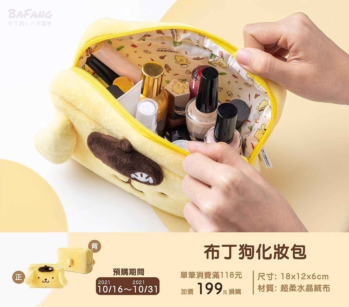 第二波推出的布丁狗化妝包、布丁狗保鮮盒,也是一定要擁有的生活萌物。布丁狗保鮮盒除了有超可愛手繪插畫以外,玻璃盒身還有分隔設計,也可以放心微波加熱,實用度100分。另一個萌遍全場的就是布丁狗化妝包,毛絨絨的手感抓起來份量感十足,容量也超能裝,每日小物裝進去絕對沒問題,三天兩夜小旅行的盥洗用品也可以,一整隻布丁狗的造型一樣有八方餃餃貝雷帽,還有立體小尾巴與超可愛屁屁,內裡還是獨家插畫造型,裡外都有驚喜。布丁狗化妝包與保鮮盒於10/16-10/31開放加價購,兩個都是一出現,就驚豔全場的超萌物品,真的無法選擇…就只好全收啦。
