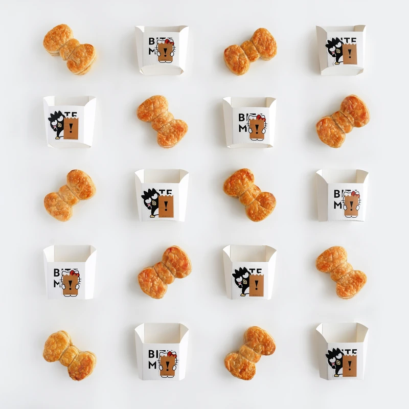 另外還以HELLO KITTY 的經典標誌「蝴蝶結」為形狀做成蘋果派,內餡表面酥脆又帶有層次的派皮,配上香甜的蘋果內餡,裝入 KITTY&酷企鵝紙盒,可愛破表。