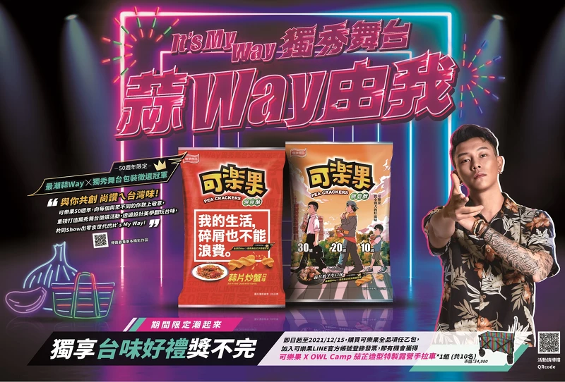除了全新口味給出驚喜之外,包裝也跟著煥然一新,之前可樂果50週年「IT’S MY WAY獨秀舞台」的金句及包裝視覺活動,透過美感備受肯定推崇的知名平面設計師方序中,以及擅長以療癒手寫金句探索人生的新世代作家張西,從眾多參賽者中所評選出的視覺包與文字包首獎作品,融入到與「蒜片炒蟹&蒜片骰子牛」的設計中,更是碰撞出台灣經典代表零食與新生代完美契合的精采火花。