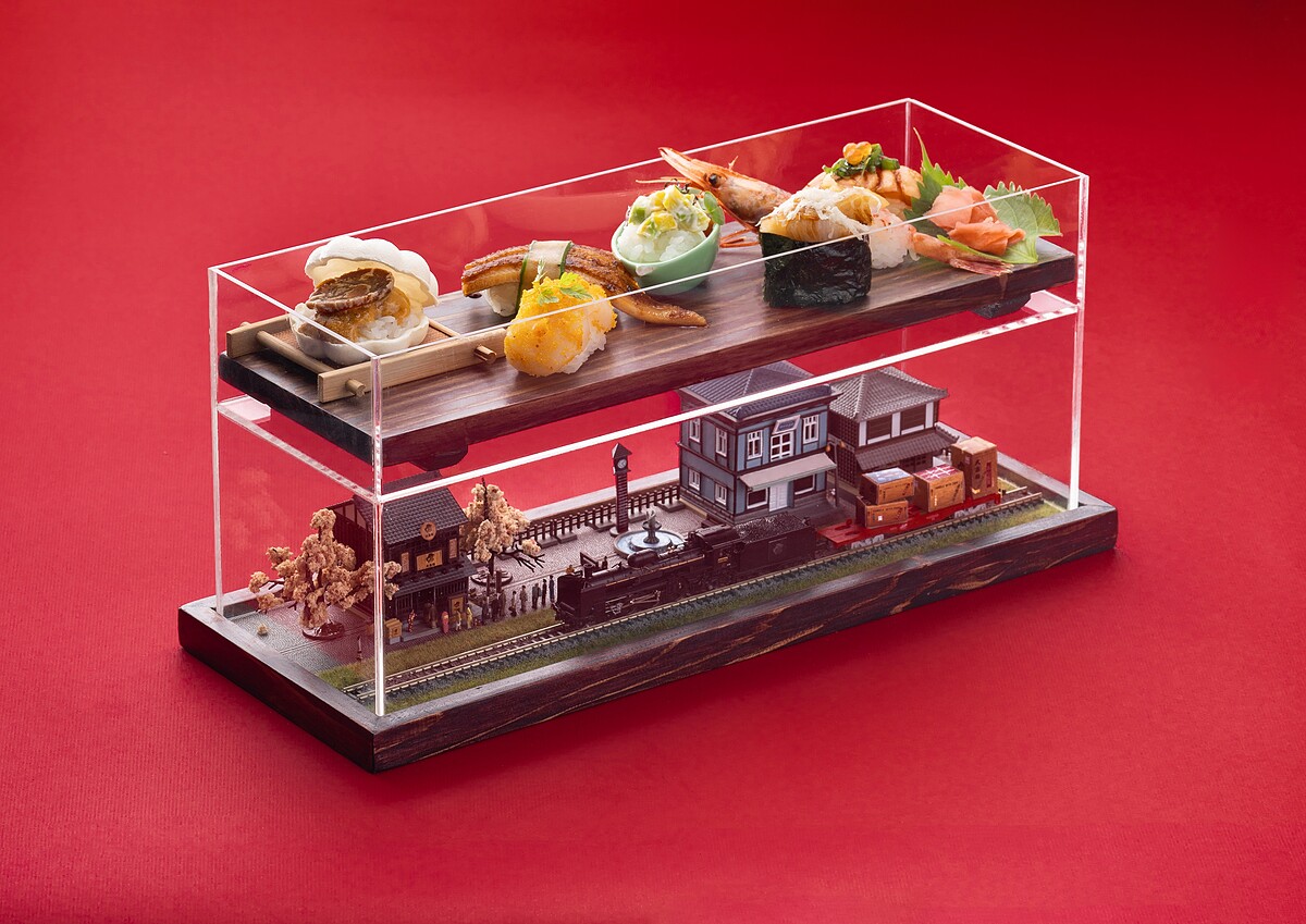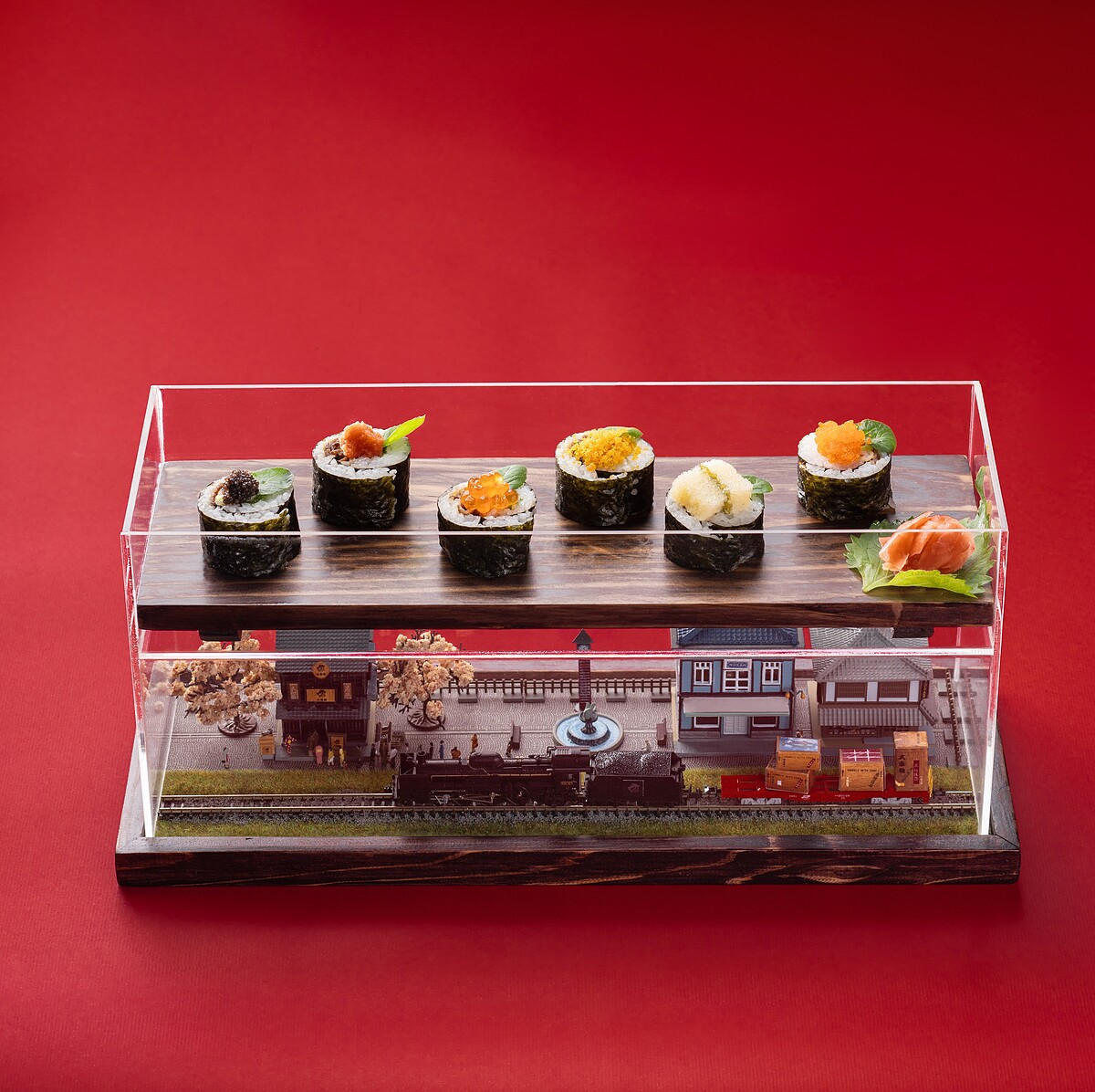 其中「大車輪の盒火車握壽司」是主廚特製的七貫盛合握壽司,包含海膽柿餅、鮪魚酪梨、炙燒比目魚、軍鑑帕瑪森起司、干貝烏魚子末,星鰻黃瓜和柚絲甜蝦。