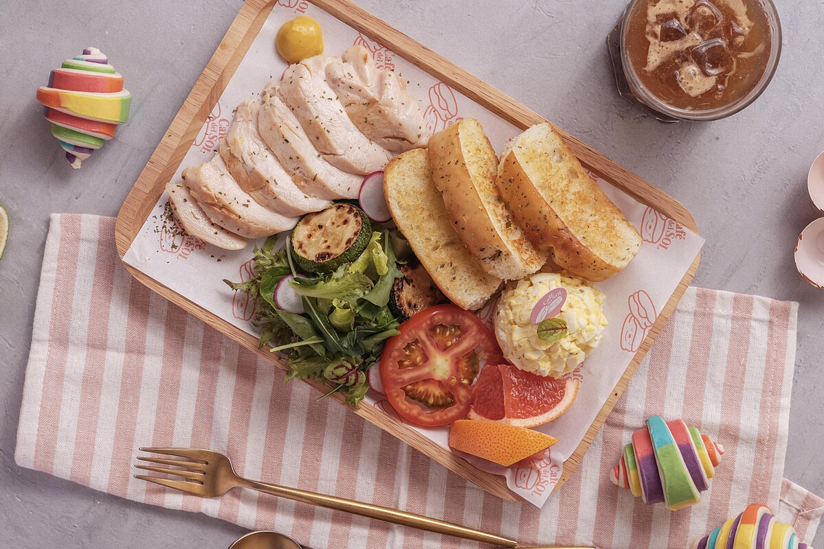 主廚經過特殊處理過後讓雞胸肉軟嫩又多汁,完全不乾柴,依照個人喜好淋上特製的柑橘油醋醬或蜂蜜芥末籽醬,讓正在減肥健身的人也能大口享用啦!