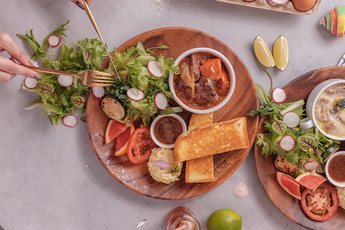 除了品嚐早午餐外,喜愛吃米飯的人也可以選擇紅酒燉牛肉,除了搭配麵包外,跟米飯更是絕配!加入新鮮的百里香、甜羅勒、月桂葉以紅酒及高湯長時間熬煮而成的牛肉,軟嫩又帶嚼勁的口感,搭配一旁時蔬、櫛瓜、日式蛋沙拉和季節水果,每一口都很滿足!