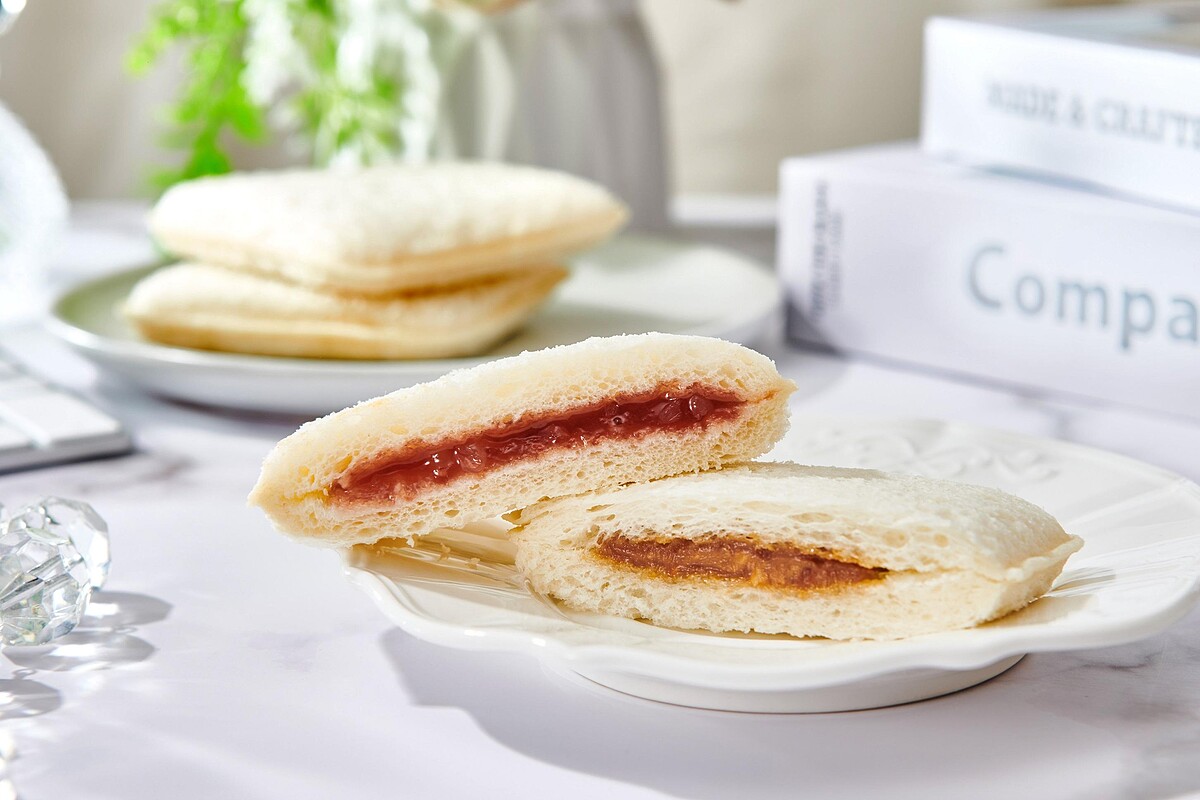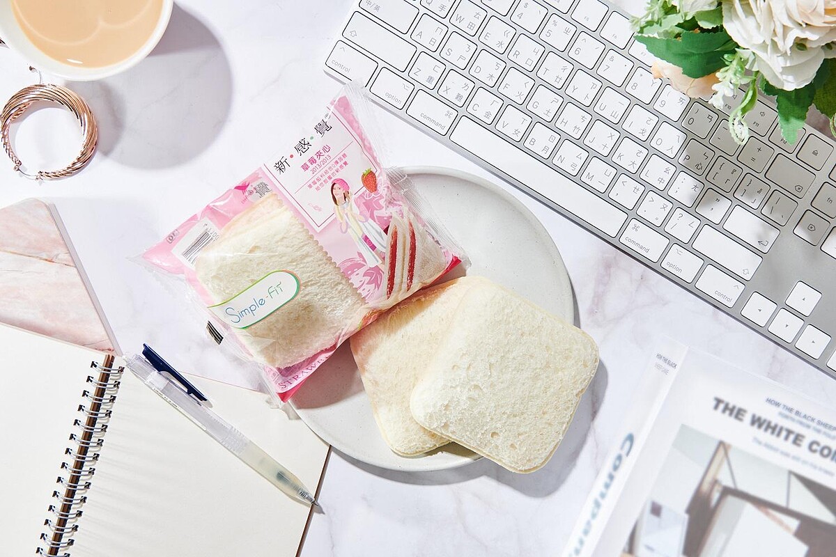 新感覺草莓夾心的草莓內餡,是經過長時間蜜漬及煉煮工法,保有草莓原味及果肉口感,再搭配上Q彈蒟蒻,無論是來杯咖啡、茶飲或果汁都很適合,今天早晨就來包新感覺草莓夾心。