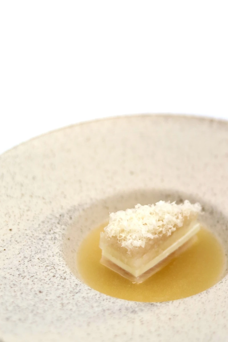 北海道干貝慕斯上,加入法國KAVIARI魚子醬、鮭魚卵、甜豆,細膩點綴上香草葉,再注入上等老母雞熬製的雞湯,加入蔬菜和湖南臘肉的法式澄清湯(consommé),入口溫潤甘美,伴隨鮮甜滋味,與高湯交織出完美風味!