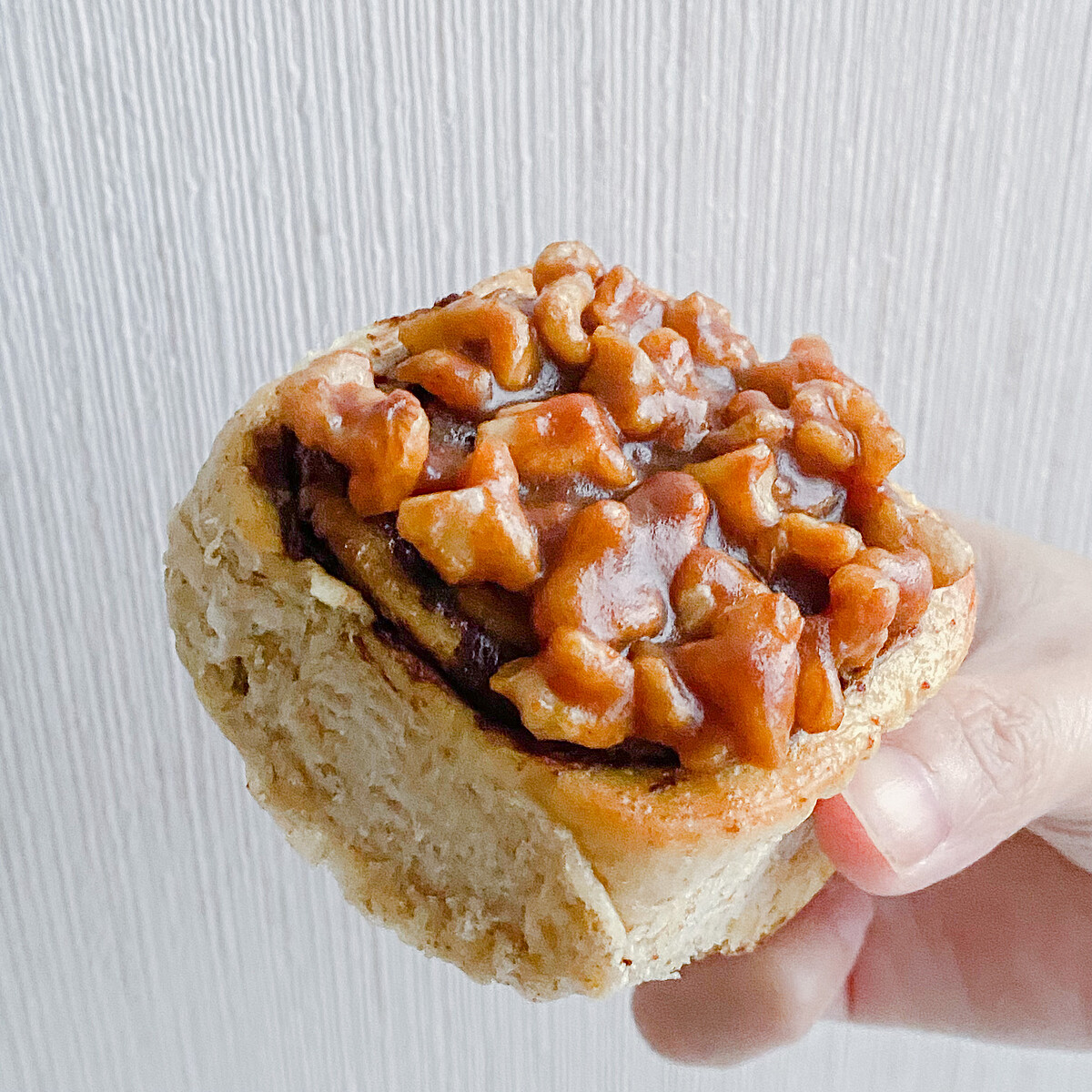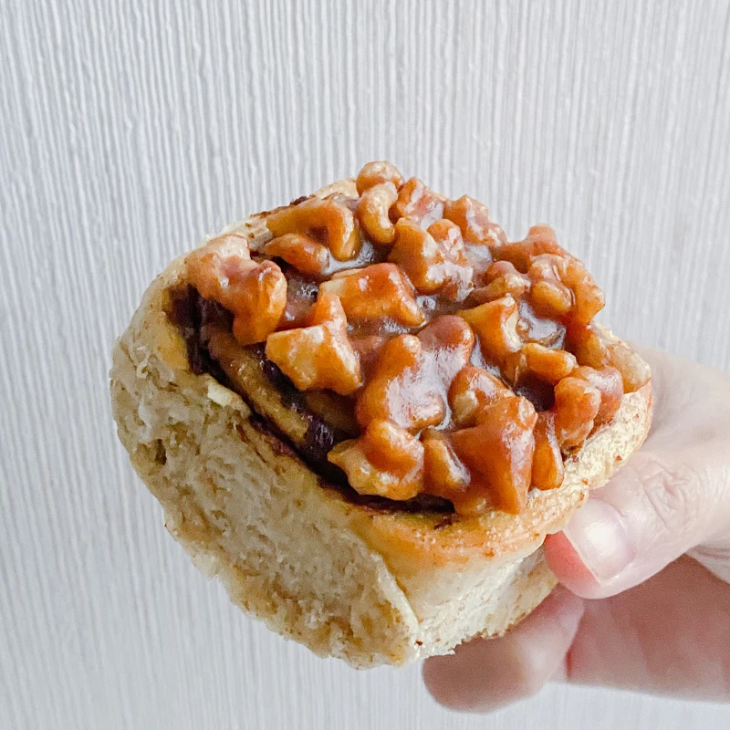 使用法國愛樂薇奶油、公平交易有機錫蘭肉桂粉、日本麵粉及白糖、台灣有機全麥粉,再撒上核桃更增添香氣與口感,光看圖片就讓人口水直流啦!