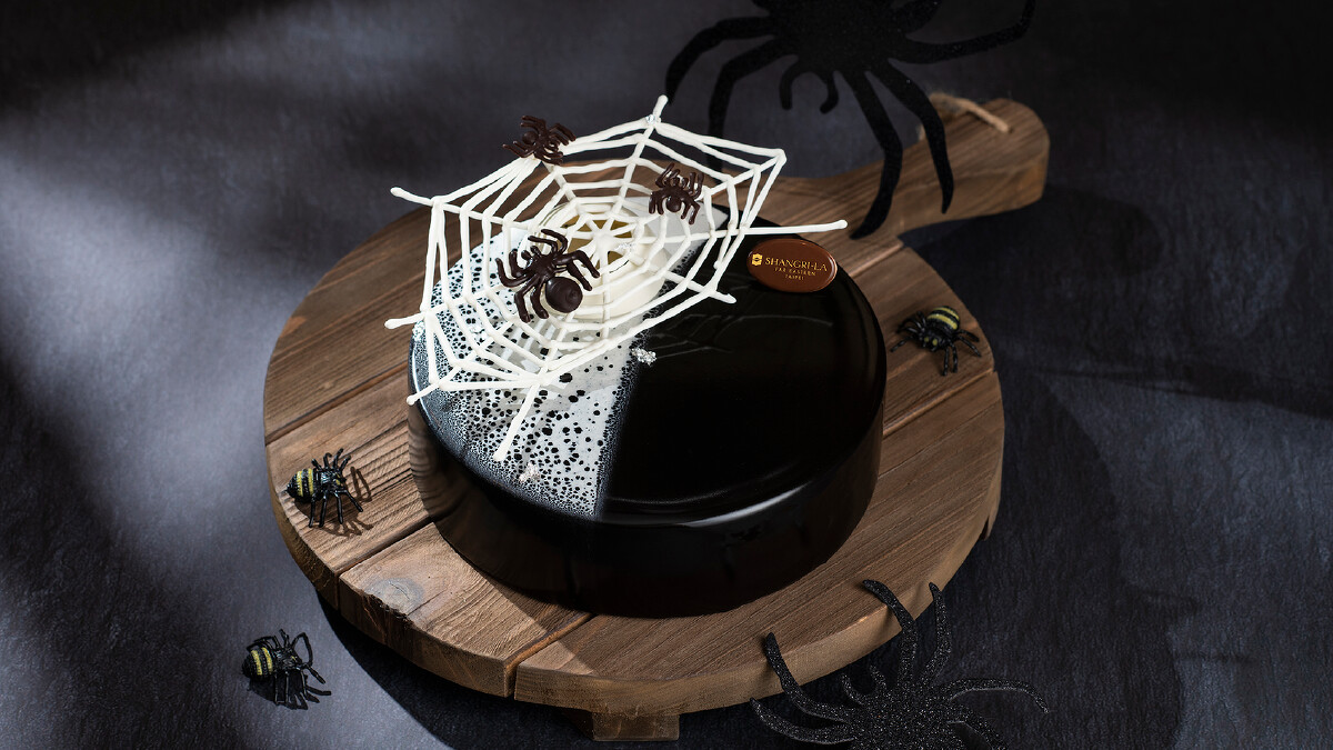 不同以往繽紛色彩的甜點,主廚為萬聖節特別端出暗黑系蛋糕,外層以巧克力糖釉呈現晶亮黑外型,襯托以白巧克力勾勒出的蜘蛛網線條,上面還有幾隻栩栩如生的蜘蛛爬行,不僅造型十分吸睛,獨特風味亦是令人驚豔!柔軟綿密的巧克力海綿蛋糕,內藏黑莓果醬餡,再以帶有伯爵茶香的奶油慕斯包覆,茶香與苦甜可可和奶油慕斯交織堆疊,多層次口感讓人情願深陷在這暗黑裡。