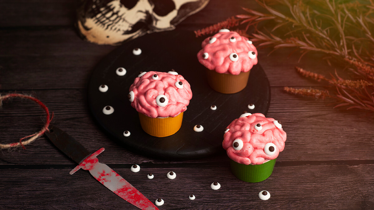 萬聖節一定要來點充滿童趣的甜點!可愛的腦袋造型杯子蛋糕,外層是香草蛋糕,咬下後流出的一股鮮紅是酸甜可口的櫻桃糖漿,腦袋造型則是以櫻桃奶油糖霜勾勒出大腦紋路,點上白巧克力造型眼球,為萬聖節畫龍點「睛」,趣味十足,絕對擄獲大小孩的心。