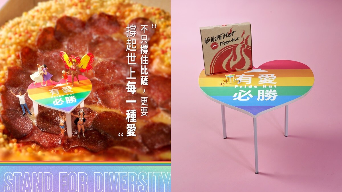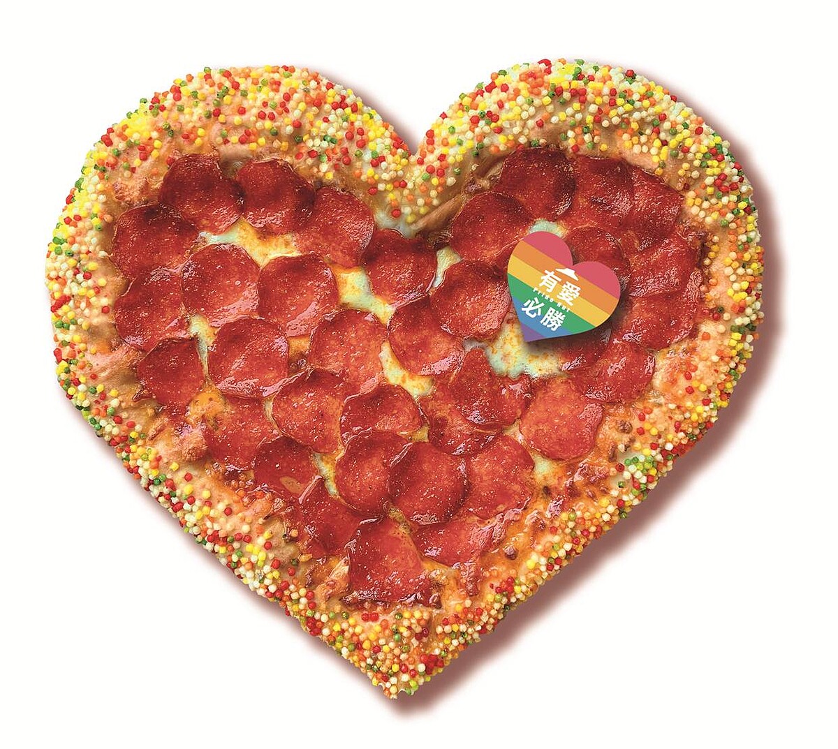 必勝客在今年為同志驕傲月首度打造「有愛必勝比薩」,以心型造型結合彩虹餅皮,代表著「愛」與「平等」,口味上則選用經典美式臘腸搭配莫札瑞拉起司製成,這款限量愛心彩虹口味絕對必吃。