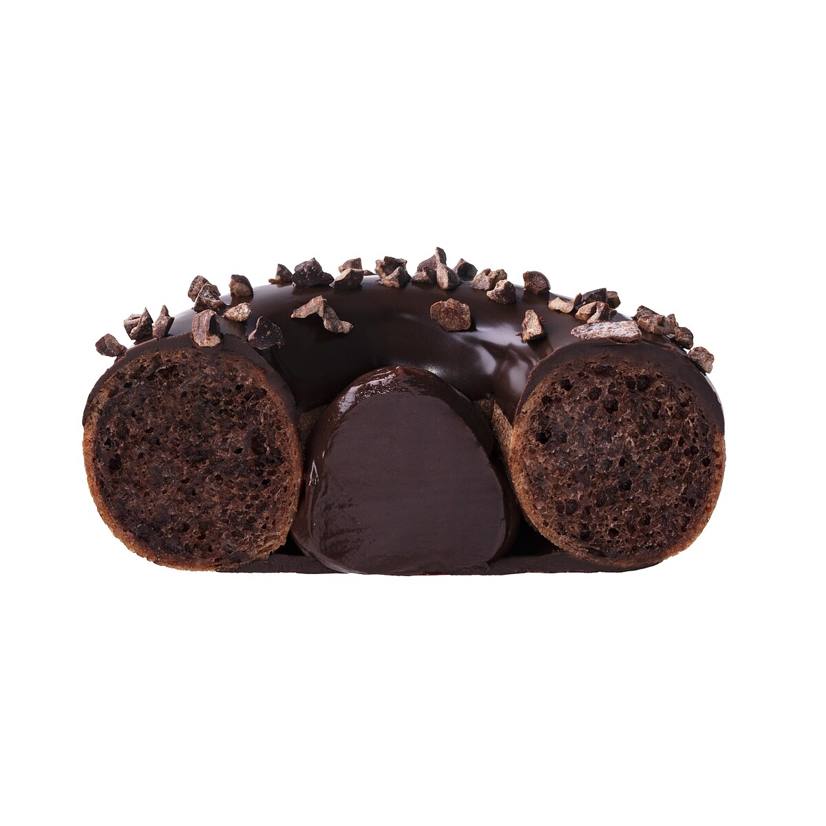 在中心加入甜而不膩的可可卡士達內餡,外層再裹上GODIVA 監修嚴選黑巧克力沾醬及可可碎粒豆。