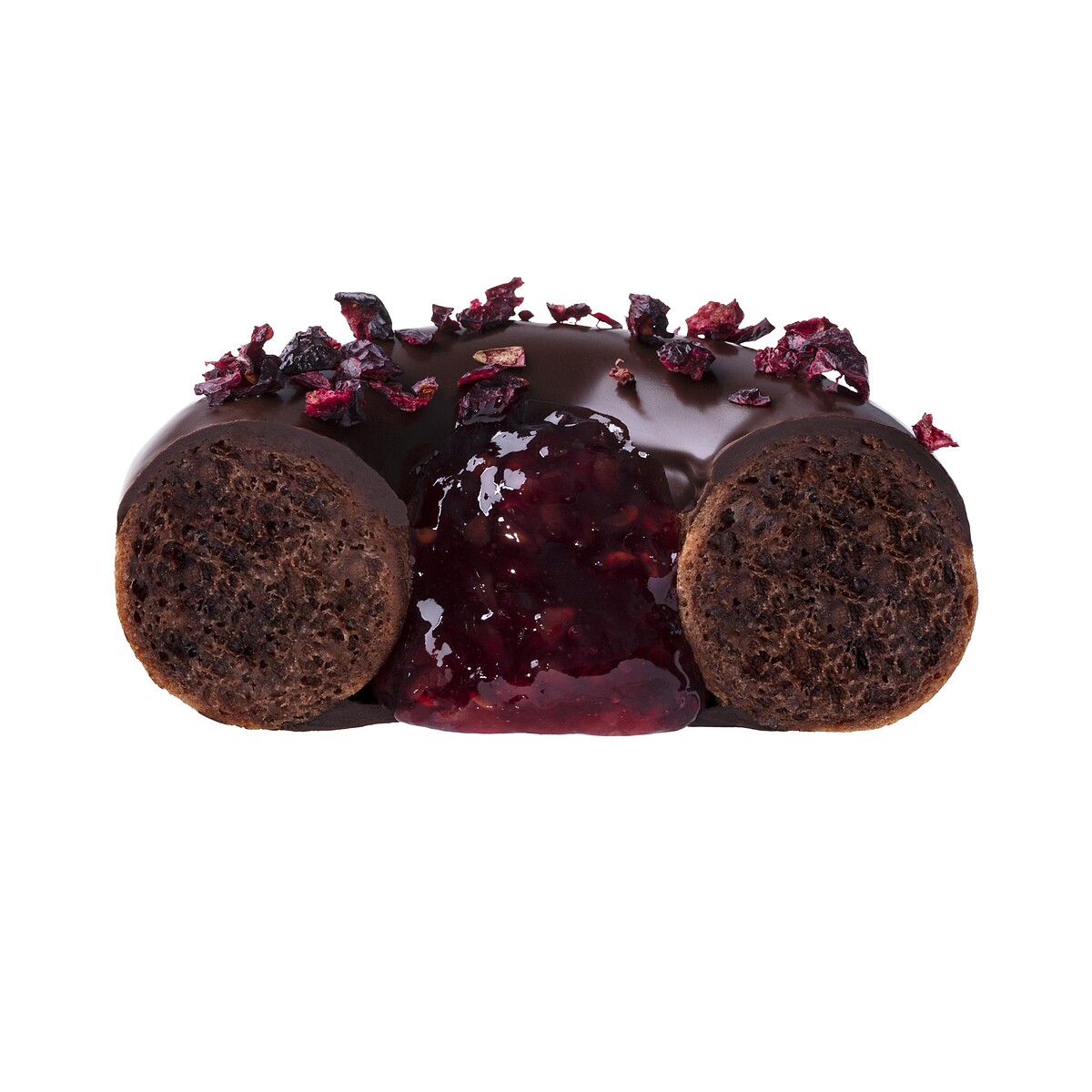 在中心加入酸甜覆盆莓果餡,外層裹上GODIVA 監修嚴選黑巧克力沾醬,佐以深紅色蔓越莓果乾點綴。