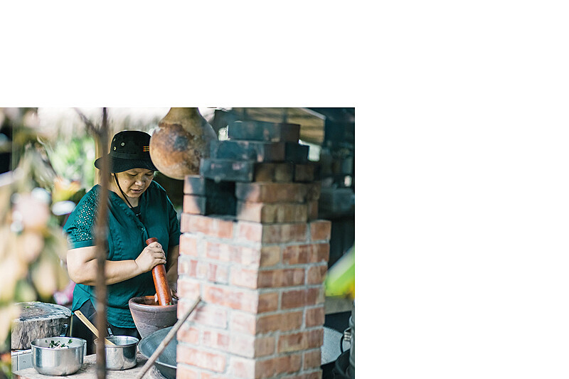 在蓋亞那工作坊只接受15人以上的訂餐,裡頭有完整的布農特色風味餐點,唯有熟門熟路的客人會指定菜色,尤其以指定荖葉套餐,她亦稱為「老饕套餐」;一開始是因為接受了由前菜到甜點都使用「荖葉」作為主要食材的任務,漸漸的做出了心得,「其實可以把它當成一種香料來使用。」因為喜歡香氣豐富的野生食材,她採集了許多同緯度的物種,包括野菜、香料,滿山遍野的植物都成了她眼中最佳素材,即便如此她始終在思考究竟什麼樣的料理是真正的傳統,從過去祖先遷移至平地,過去在舊部落的產物、環境或許應該要保留下來,蓋亞那工作坊開始供餐後她驚覺這是很值得被記錄保存,所以對於未來她期望帶著部落耆老、團隊走一趟舊部落,將布農族過去飲食、生活完整的記錄下來,「原來這就是做餐食的使命,開始以為只是一套簡單的風味餐,但是漸漸的深度挖掘,才發現這些食物都有值得被關注以及被保留的意義。」Ibu遞上一片荖葉,在咀嚼後嗆辣感直衝腦門,這看似單純寬厚的風土藏著如此豐饒的飲食文化,裡頭是千變萬化的味覺衝擊,那些未曾想過的辛辣、香甜就在深山、大海、縱谷裡,是需要被大家重新認識獨特又黏人的土地。