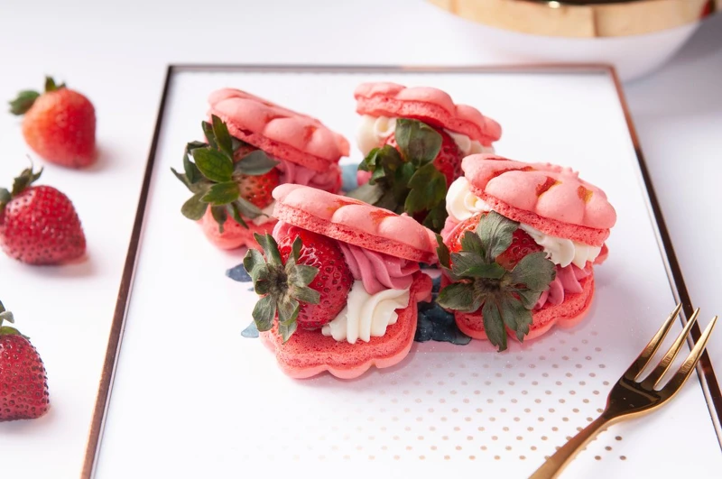 馬卡龍的外型宛如貝殼般優雅,內餡加入了香草與覆盆莓口味的瑞士奶油糖霜,夾心附上一顆鮮紅草莓。一口咬下感受香酥外殼與華順內餡,伴隨草莓果香,打造視覺與味蕾的完美饗宴!