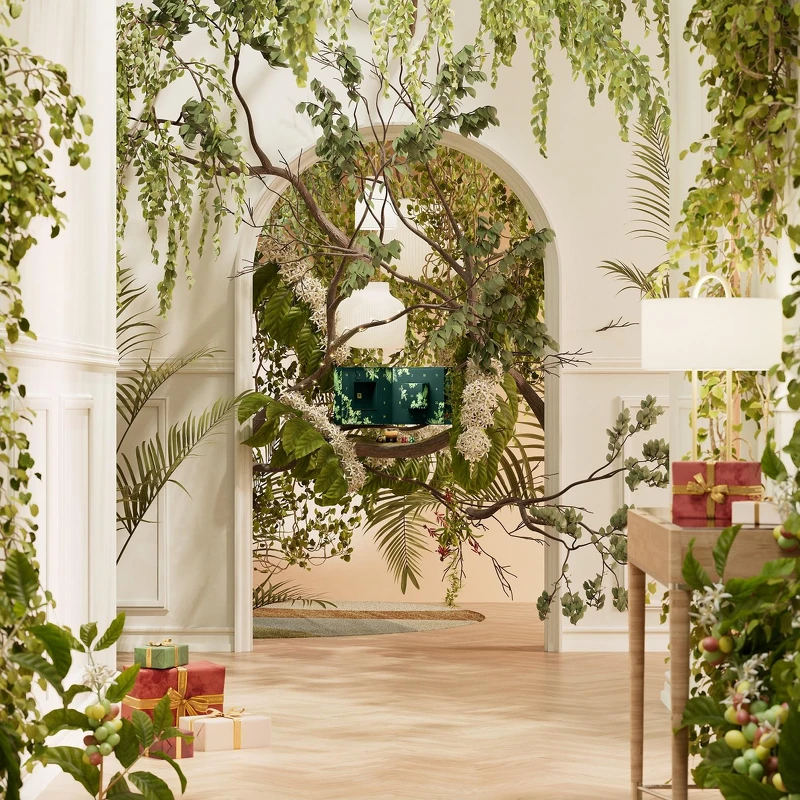 森林之心耶誕倒數月曆以永續代表色,以低調優雅的綠色作為襯底,象徵著寧靜、平衡及森林的生生不息,運用繚繞的藤蔓及珍稀鳥禽遍佈盒身,感謝森林馥郁的滋養。