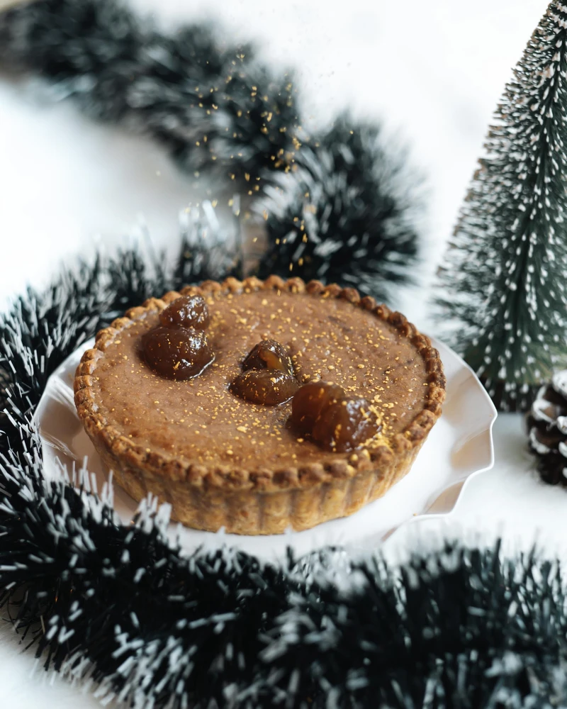 以自製的藍莓果醬為基底,綿密法國沙巴東栗子泥與蘭姆酒完美結合,上層再以糖漬栗子點狀,一口咬下感受酥香塔皮與香濃栗子餡的美好風味,帶有微酸的藍莓果香中和了栗子的甜膩,每一口都香甜細柔!