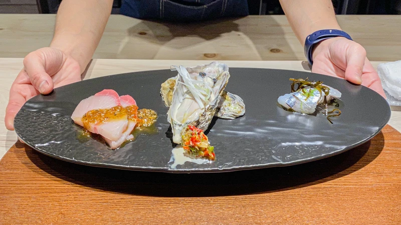 將時令鮮魚端上桌,每日菜色以當日食材為主,當天品嘗到的是水針魚、廣島生蠔以及青甘魚,而主廚各自為這三種海鮮搭配不同的佐料,替味蕾帶來極致享受,而廣島生蠔所搭配的是自製的生七味醬真的讓人非常驚艷!