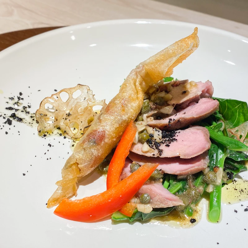 以低溫熟成的豬肩胛肉搭配金黃香酥的春捲、時蔬等,豬肩胛肉帶有些許嚼勁的爽脆口感,推薦大家佐以一旁的堤魚醬汁非常清爽!香酥春捲在內餡加入竹筍與番茄,入口感受酥與脆的口感,伴隨清爽酸甜味,真的非常好吃!