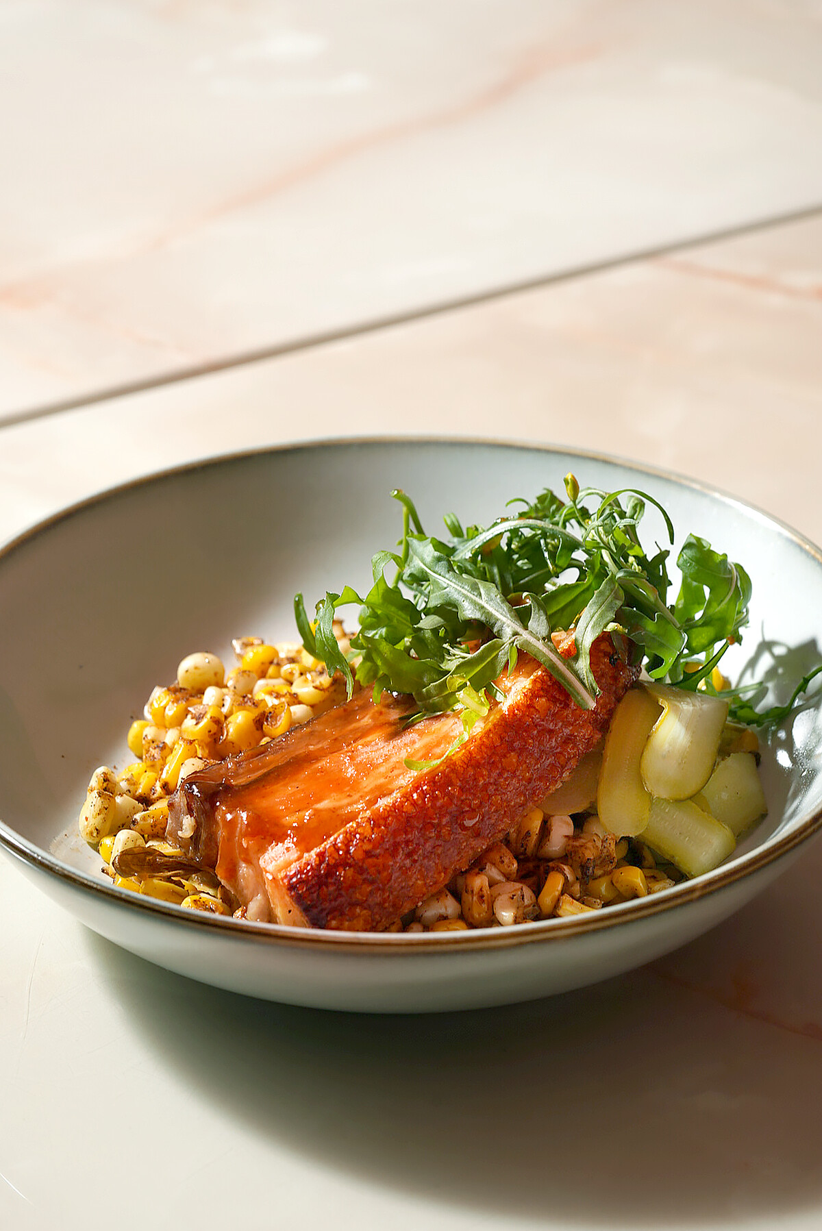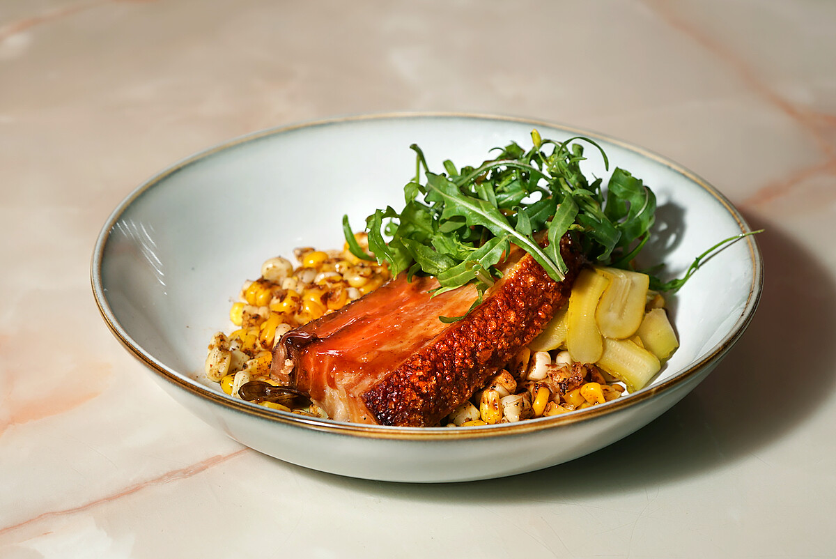 嚴選花田喜彘的紅蘿蔔豬,帶皮五花肉以炭火烘烤,再刷上一層以烤肉醬、焦糖味噌、沙茶醬和客家桔醬製成特調醬料,讓五花肉的表層酥脆、並帶有些許炭香,搭配煙燻過的黃玉米粒及甘蔗玉米粒,佐以微苦的芝麻葉、季節漬物中和風味,在口中彷彿像在吃烤玉米般。