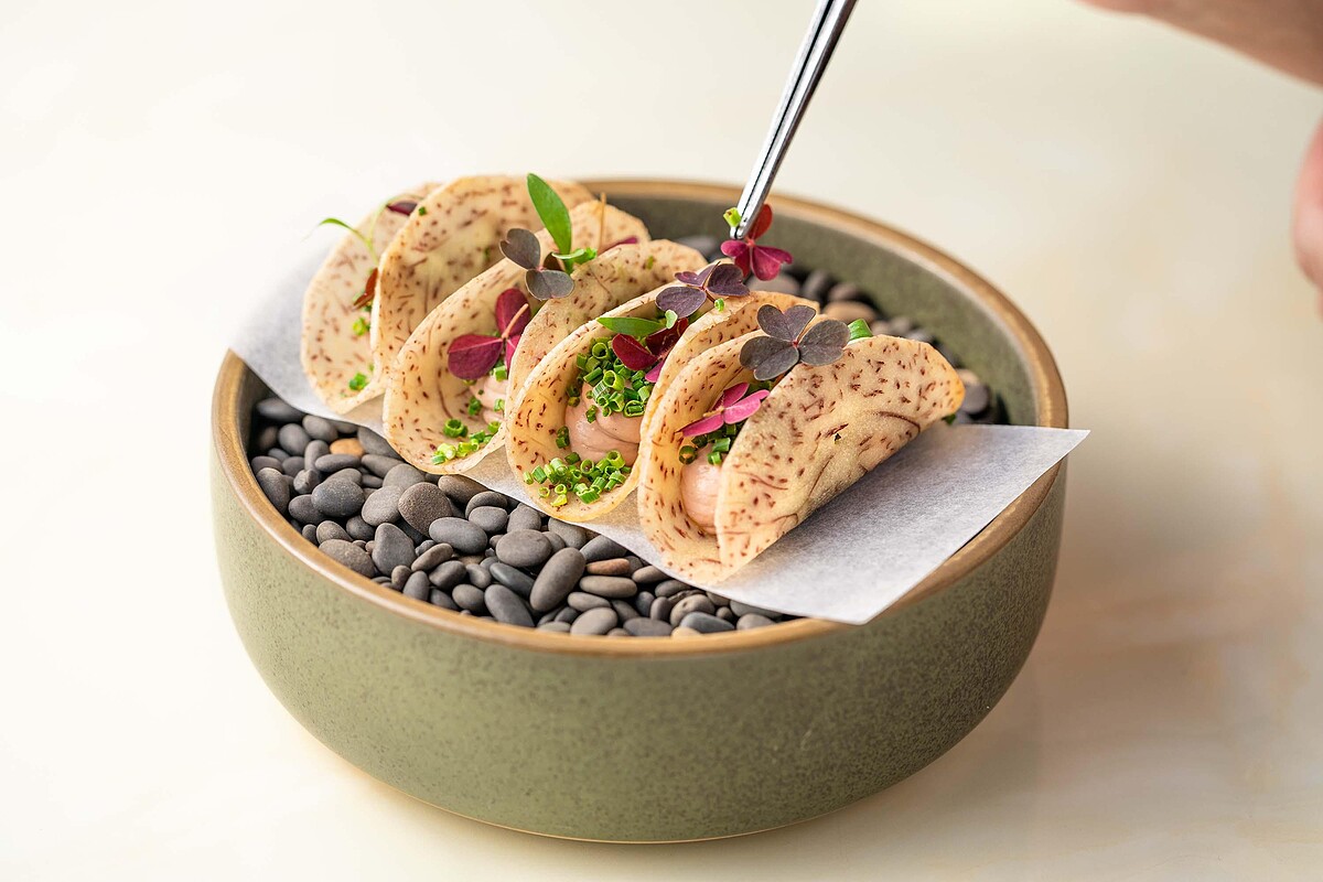 慕斯以雞肝、臘肉與酸奶製作而成,在擠入酥脆的芋頭片中,用蝦夷蔥碎、紅色酢漿草點綴,再加入特製的醬油焦糖醬、醃漬西瓜綿提升口感層次、增添清爽感,打開味蕾感官,替美好一的餐帶來精彩的開場!