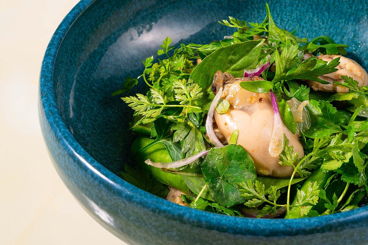靈感來自經典「豆豉牡蠣」,以蒜油及碎豆豉浸泡牡蠣,使用油封手法來保持牡蠣的肥美鮮甜,將油封牡蠣醬汁拌入紅骨九層塔、山蘿蔔葉、香菜、青龍椒等當季香草中,再加入檸檬丁點綴,清爽鮮甜的風味在口中迸發,每一口都呈現不同風味,讓人驚艷!