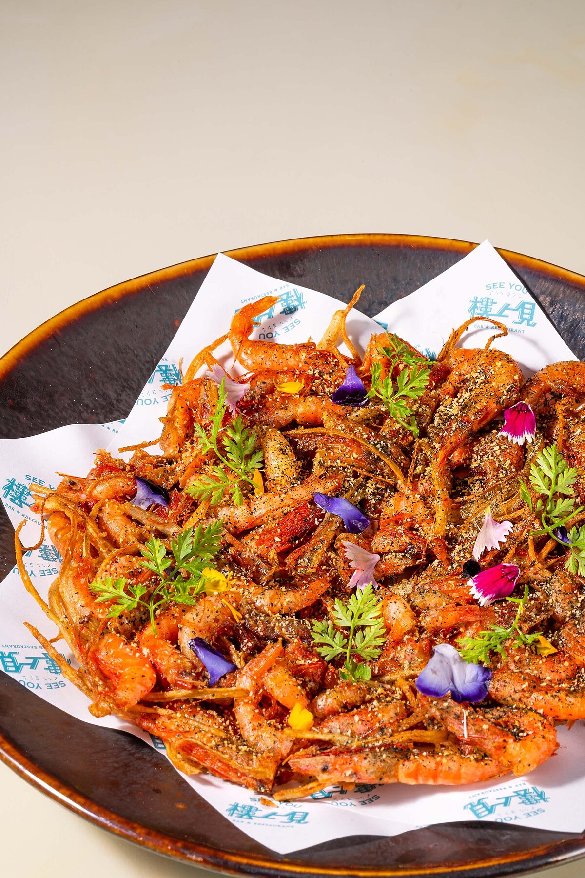 將港口常見到的炸蝦餅精緻化,將龜山島海蝦混合牛蒡絲與天婦羅麵糊油炸,起鍋後灑上椒鹽粉、蒜頭碎及食用花裝飾,醬料則是基隆獨特的「丸進辣椒醬」,甜辣的味噌辣醬與天婦羅就是最完美搭配!