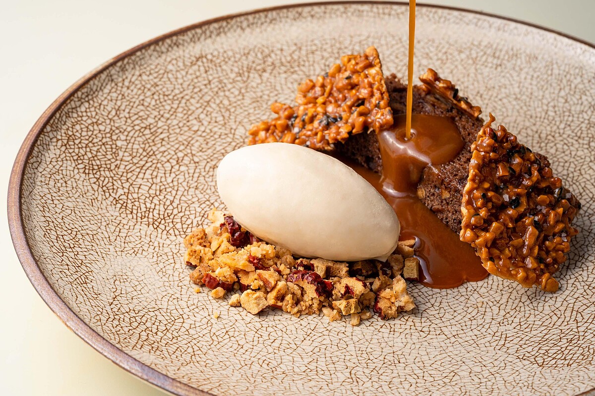 除了大膽翻玩經典中菜,甜點師也結合中西式甜品元素,以自製南棗糕配搭絲滑順口的太妃糖醬、鹽堅果脆片更增添口感,綴以脆口的紅棗碎與冰淇淋,入口感受香甜氣息與多層次口感,替一餐劃下最美好的ending!